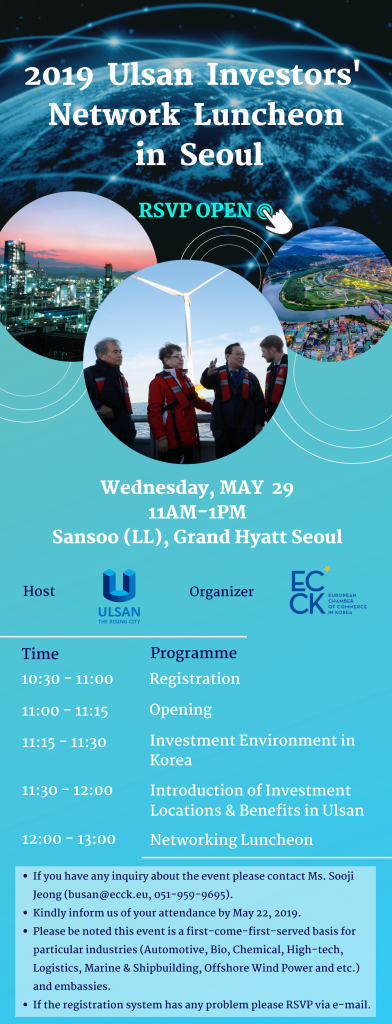 may 2019 29may11:00 AM1:00 PM2019 Ulsan Investors’ Network Luncheon in SeoulECCK Events:ECCK Event Details Event Details Time (Wednesday) 11:00 AM - 1:00 PM LocationSansoo (LL), Grand Hyatt Seoul322 Sowol-ro, Hannam-dong, Yongsan-gu, Seoul CalendarGoogleCal