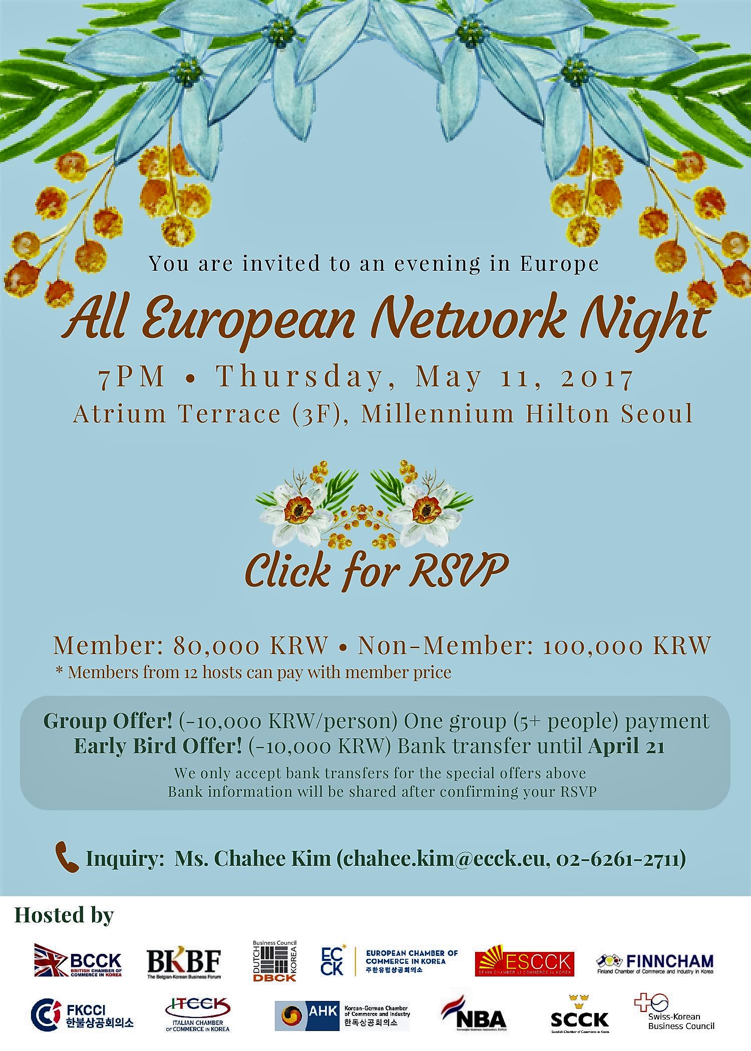 may 2017 11may7:00 PM9:00 PM2017 All European Network NightECCK Events:ECCK Event DetailsClick here for RSVP If you can’t approach above link (google link), please contact Ms. Chahee Kim through rk.ro.kcce@mik.eehahc or 02-6261-2711. Event Details Click here for RSVP If you can’t approach above link (google link), please contact Ms. Chahee Kim through rk.ro.kcce@mik.eehahc or 02-6261-2711. Click here to see the invitation. Find Our Partnership Proposal for 2017 All European Network Night. Time(Thursday) 7:00 PM - 9:00 PM CalendarGoogleCal