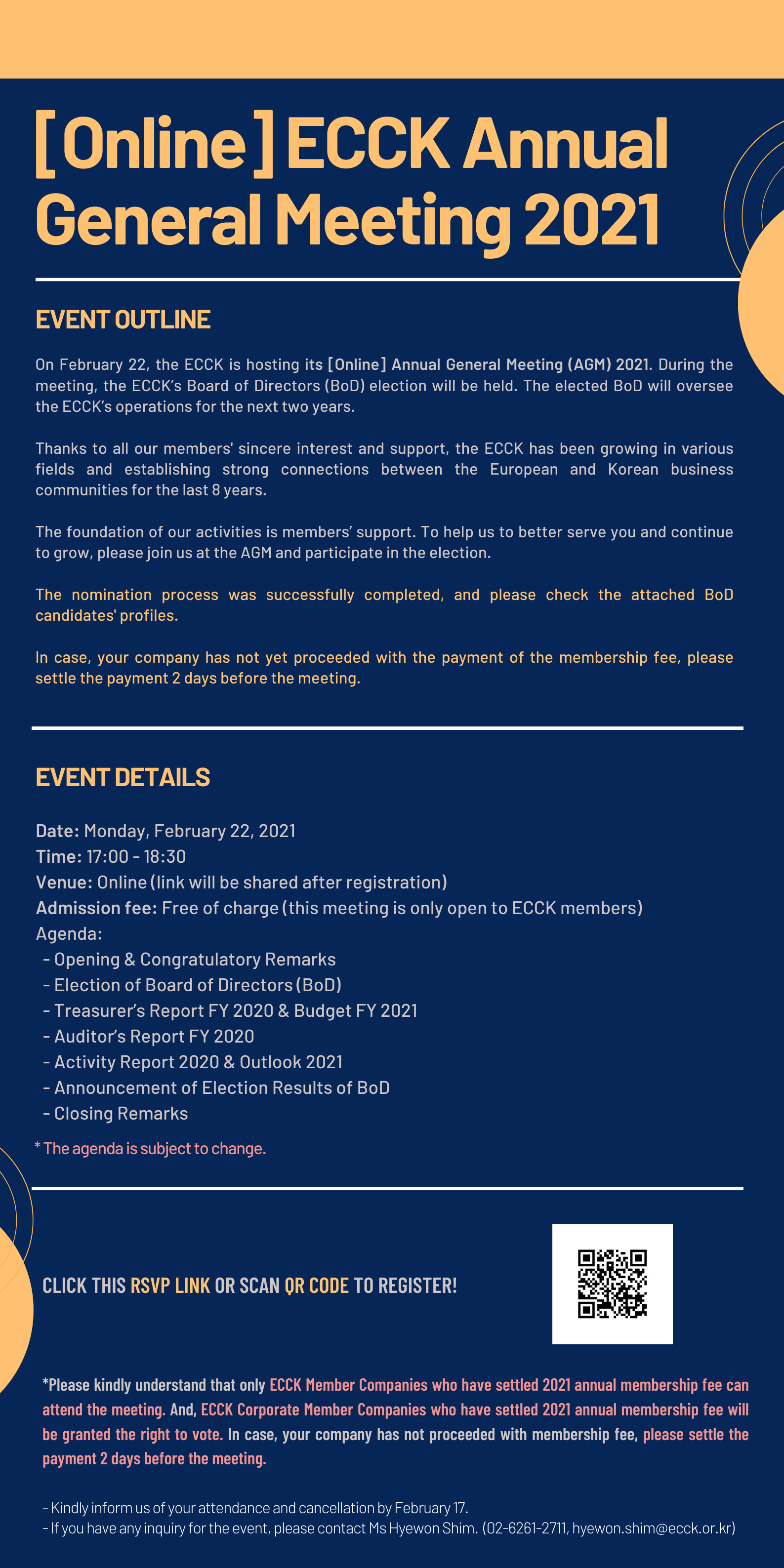february 2021 22feb5:00 PM6:30 PM[Online] ECCK Annual General Meeting 2021ECCK Events:ECCK Event DetailsRSVP Closed! [Online] ECCK Annual General Meeting 2021_Invitation Event Details RSVP Closed! [Online] ECCK Annual General Meeting 2021_Invitation Time(Monday) 5:00 PM - 6:30 PM CalendarGoogleCal