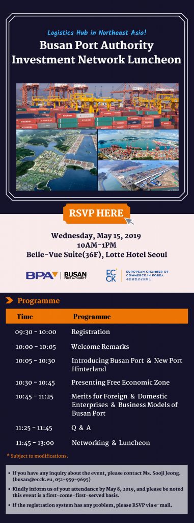 may 2019 15may10:00 AM1:00 PMBusan Port Authority Investment Network LuncheonECCK Events:ECCK Event Details Event Details Time (Wednesday) 10:00 AM - 1:00 PM LocationBelle-vue Suite (36F), Lotte Hotel Seoul30, Eulji-ro, Jung-gu, Seoul, Korea Lotte Hotel Seoul CalendarGoogleCal