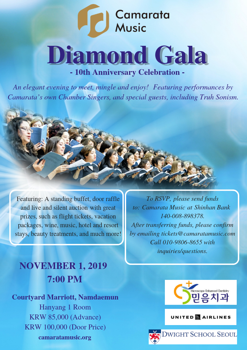 Camarata Music is a Korean-registered non-profit organization that creates global communities through the universal language of music by providing collaborative performance opportunities to musicians of multiple nationalities residing in Korea. All proceeds will support the Camarata Music’s Concert Series and Outreach program. All donations, or a portion thereof, may be eligible for tax deductions.