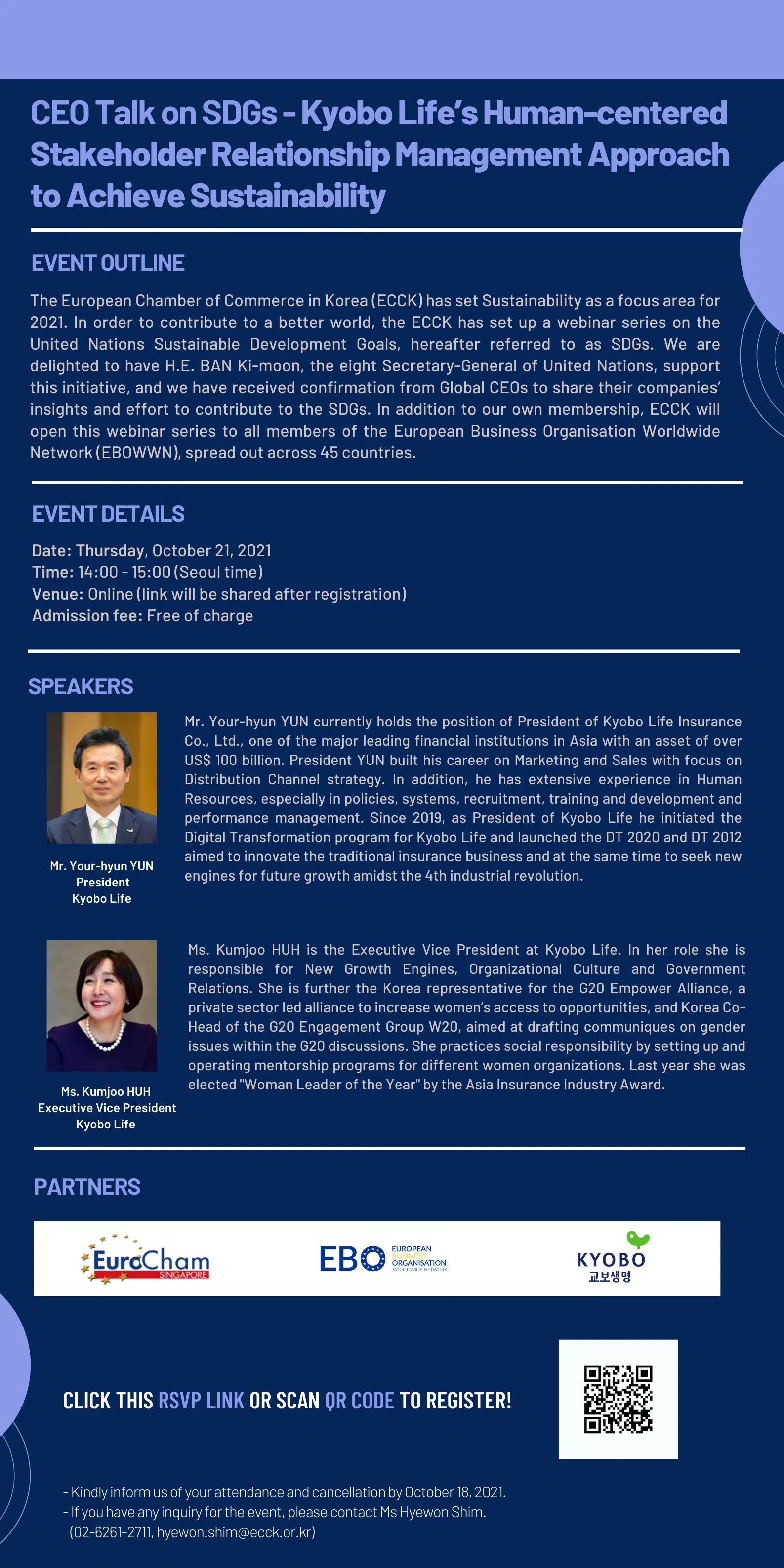 october 2021 21oct2:00 PM3:00 PMCEO Talk on SDGs - Kyobo Life’s Human-centered Stakeholder Relationship Management Approach to Achieve SustainabilityECCK Events:ECCK Event DetailsRSVP Closed! CEO Talk on SDGs_Kyobo Life’s Human-centered Stakeholder Relationship Management Approach to Achieve Sustainability_Invitation Event Details RSVP Closed! CEO Talk on SDGs_Kyobo Life’s Human-centered Stakeholder Relationship Management Approach to Achieve Sustainability_Invitation Time(Thursday) 2:00 PM - 3:00 PM CalendarGoogleCal
