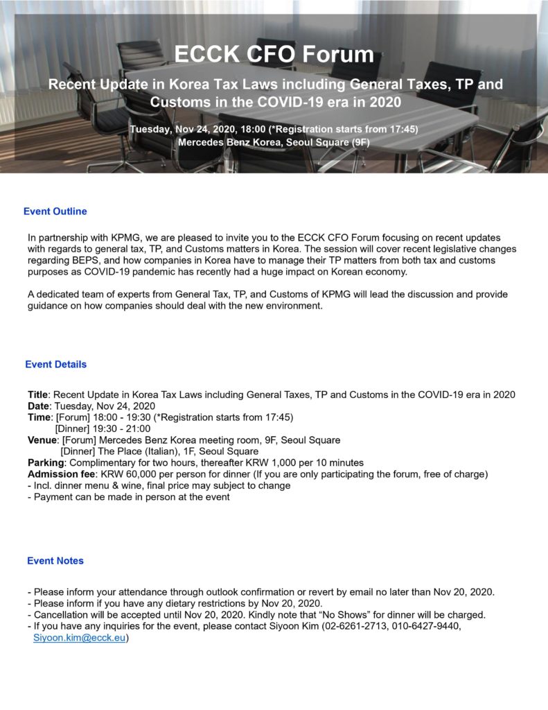 november 2020 24nov6:00 PM9:00 PMECCK CFO ForumECCK Events:ECCK Event Details ECCK CFO Forum_Invitation Event Details ECCK CFO Forum_Invitation Time(Tuesday) 6:00 PM - 9:00 PM CalendarGoogleCal