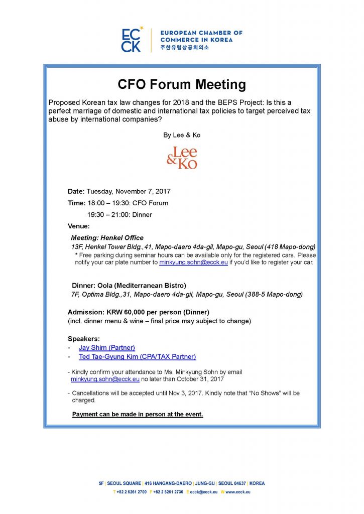 november 2017 07nov6:00 PM9:00 PMCFO Forum MeetingECCK Events:ECCK Event Details Event Details Time (Tuesday) 6:00 PM - 9:00 PM Location13F Henkel Tower Building41, Mapo-daero 4da-gil, Mapo-gu, Seoul CalendarGoogleCal