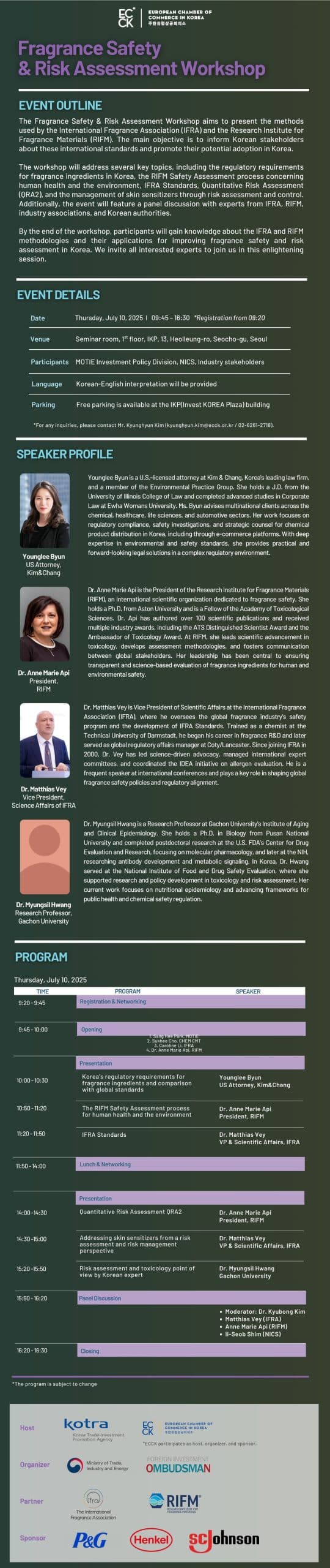 The ECCK Chemical Committee is pleased to invite you to the upcoming Fragrance Safety & Risk Assessment Workshop. Please save the date and join us for an engaging session on fragrance knowledge, safety, and risk assessment.