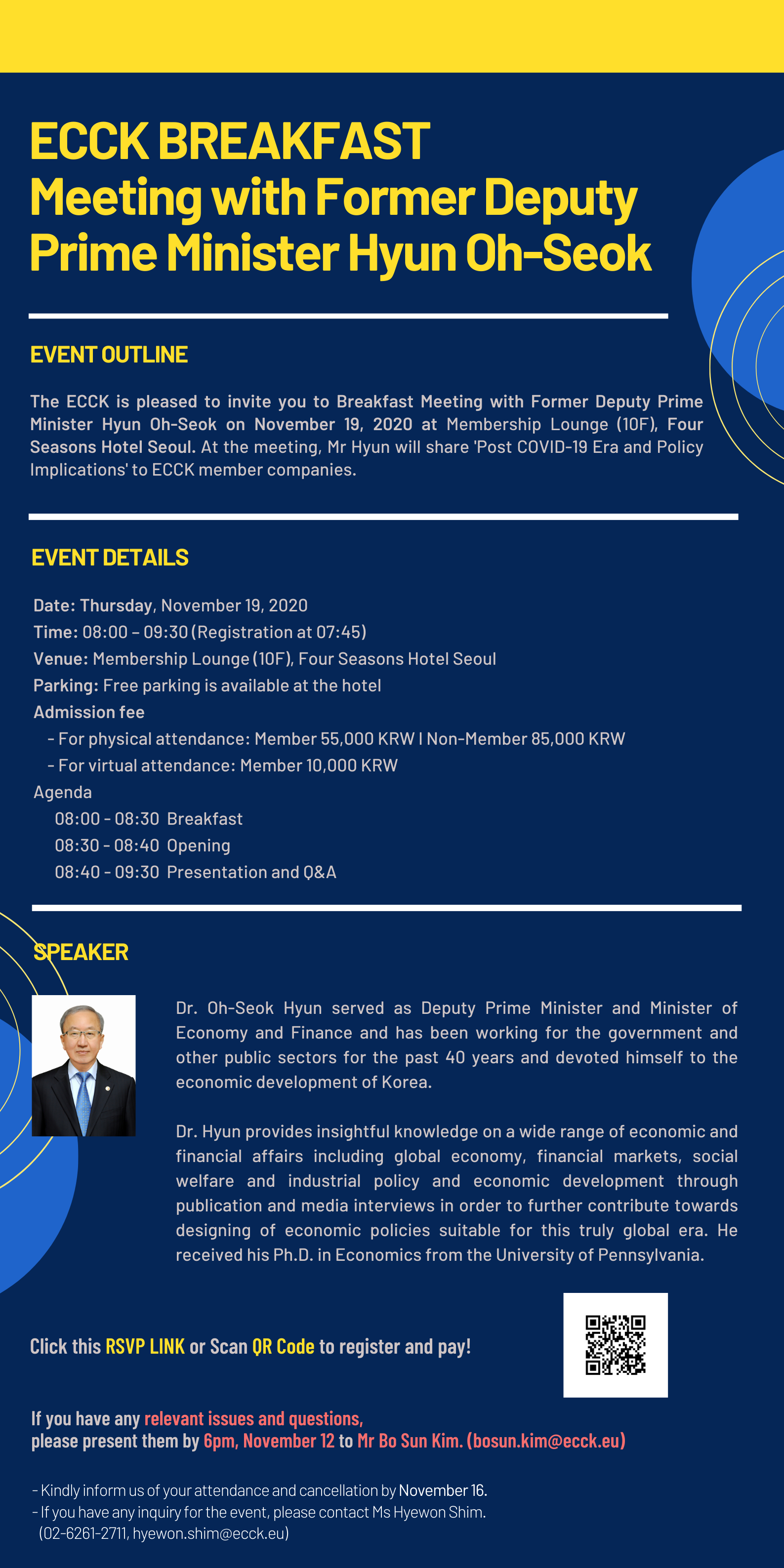 november 2020 19nov8:00 AM10:00 AMECCK Breakfast Meeting with former Deputy Prime Minister Oh-Seok HyunECCK Events:ECCK Event DetailsRSVP ClOSED! ECCK Breakfast Meeting with former Deputy Prime Minister Oh-Seok Hyun_Invitation Event Details RSVP ClOSED! ECCK Breakfast Meeting with former Deputy Prime Minister Oh-Seok Hyun_Invitation Time (Thursday) 8:00 AM - 10:00 AM LocationMembership Lounge (10F), Four Seasons Hotel Seoul97 Saemunan-ro, Sinmunno 1(il)-ga, Jongno-gu, Seoul CalendarGoogleCal