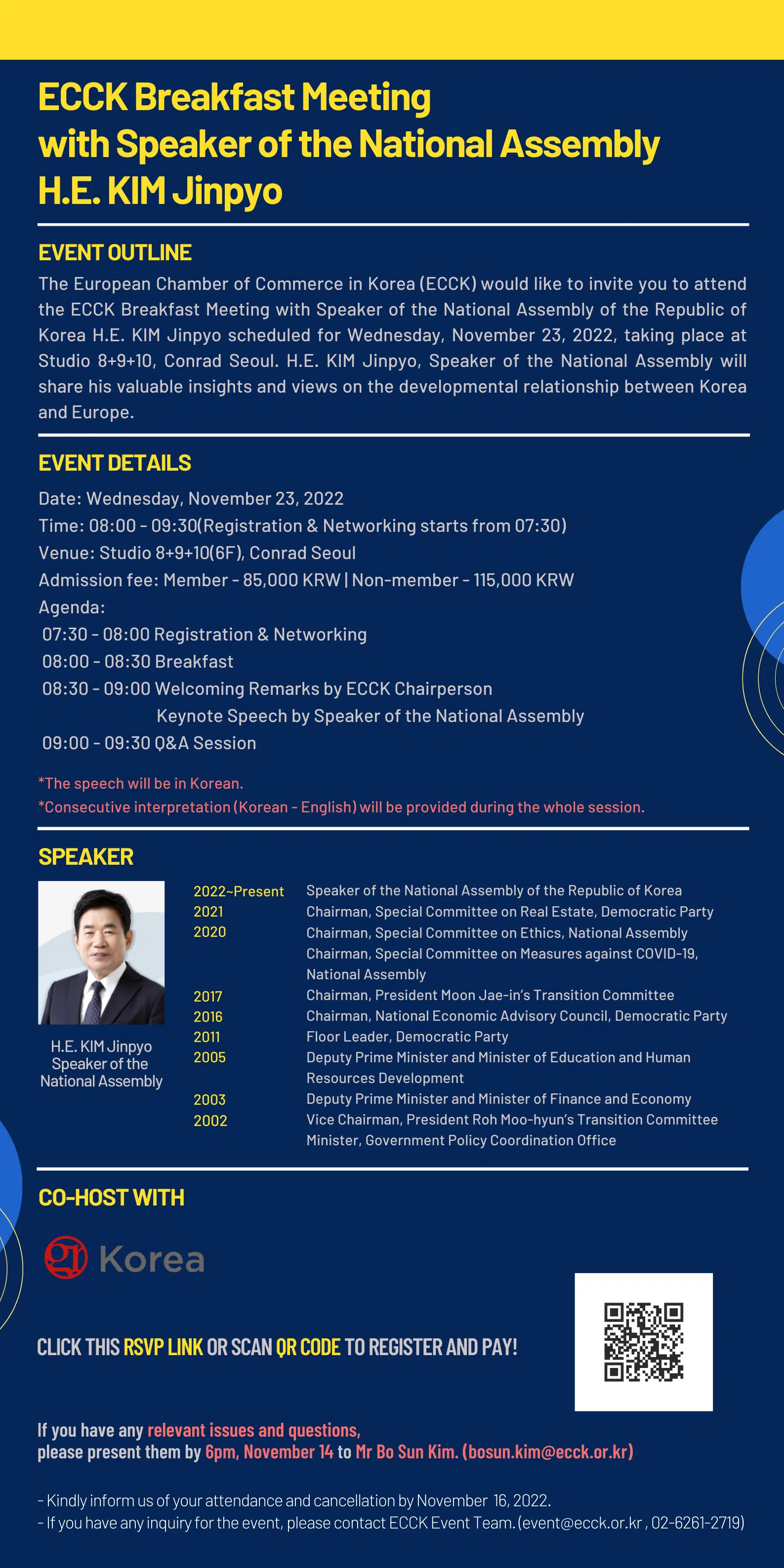 november 2022 23nov8:00 AM9:30 AMECCK Breakfast Meeting with Speaker of the National Assembly H.E. KIM JinpyoECCK Events:ECCK Event DetailsRSVP Closed ECCK Breakfast Meeting with Speaker of the National Assembly_Invitation_November 23 Event Details RSVP Closed ECCK Breakfast Meeting with Speaker of the National Assembly_Invitation_November 23 Time (Wednesday) 8:00 AM - 9:30 AM LocationStudio 8+9+10 (6F), Conrad Seoul CalendarGoogleCal