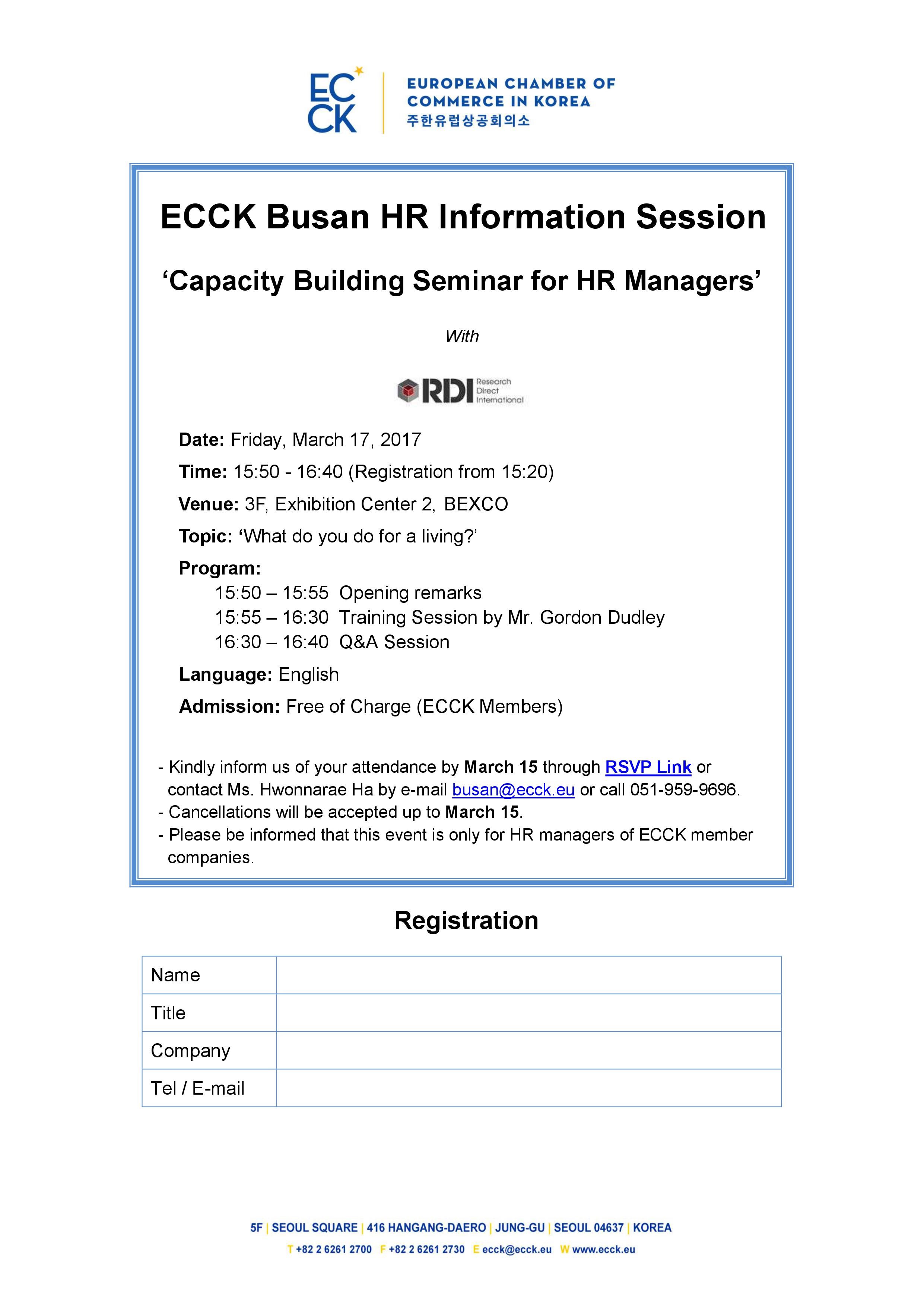 march 2017 17mar3:50 PM4:40 PMEvent OverECCK Busan HR Information SessionECCK Events:ECCK Busan RSVP NowRSVPing is closed at this time. Can not make it to this event?Change my RSVP Event Details Click here to see the invitation. Click here to find the speaker’s profile. Event Details Click here to see the invitation. Click here to find the speaker’s profile. Time(Friday) 3:50 PM - 4:40 PM CalendarGoogleCal