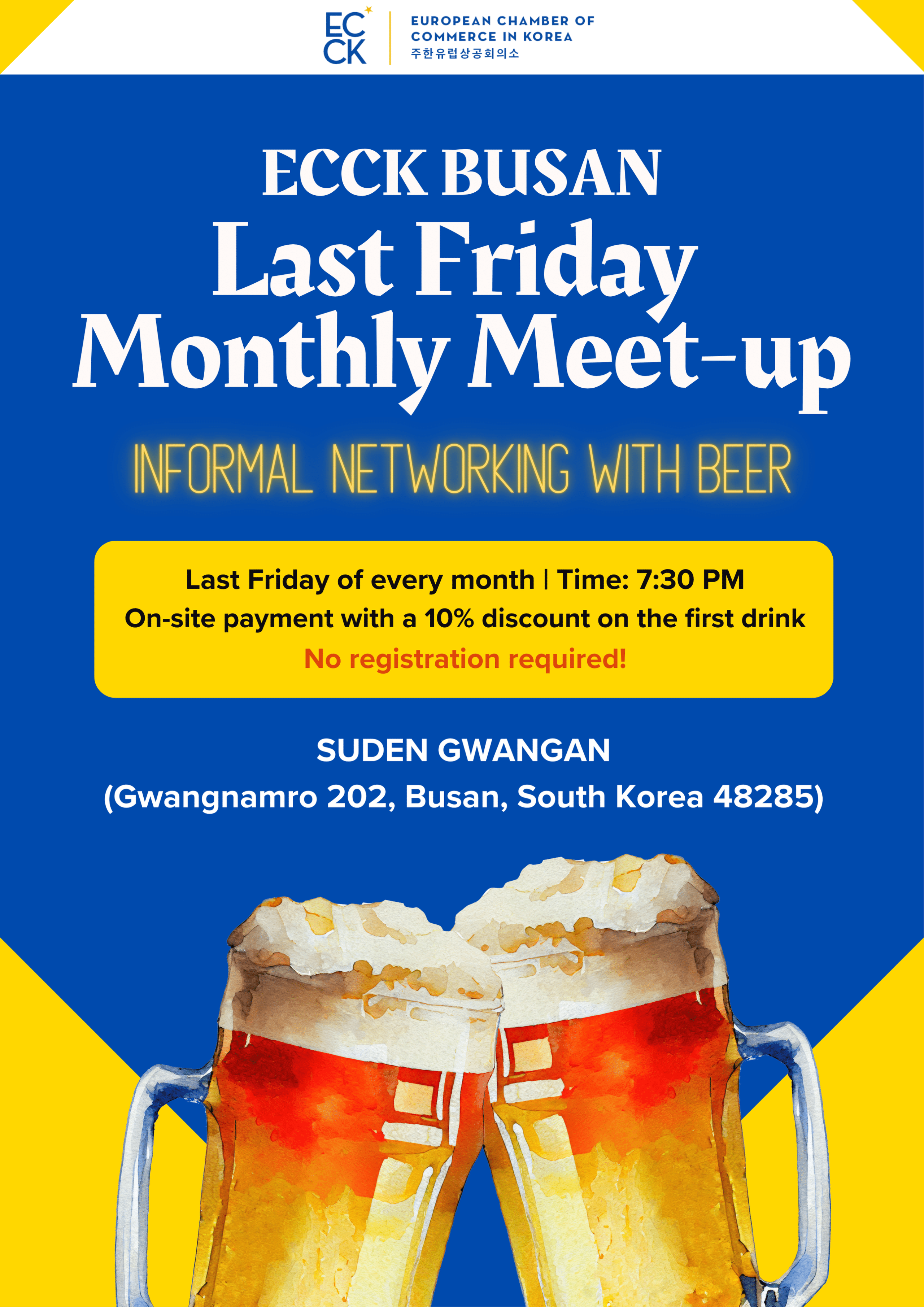 march 2025 28mar7:30 PM9:30 PMECCK Busan Informal Friday Monthly Meet-upECCK Events:ECCK Busan Event Details Event Details Time (Friday) 7:30 PM - 9:30 PM LocationSuden GwanganGwangnamro 202, Busan, South Korea 48285 CalendarGoogleCal