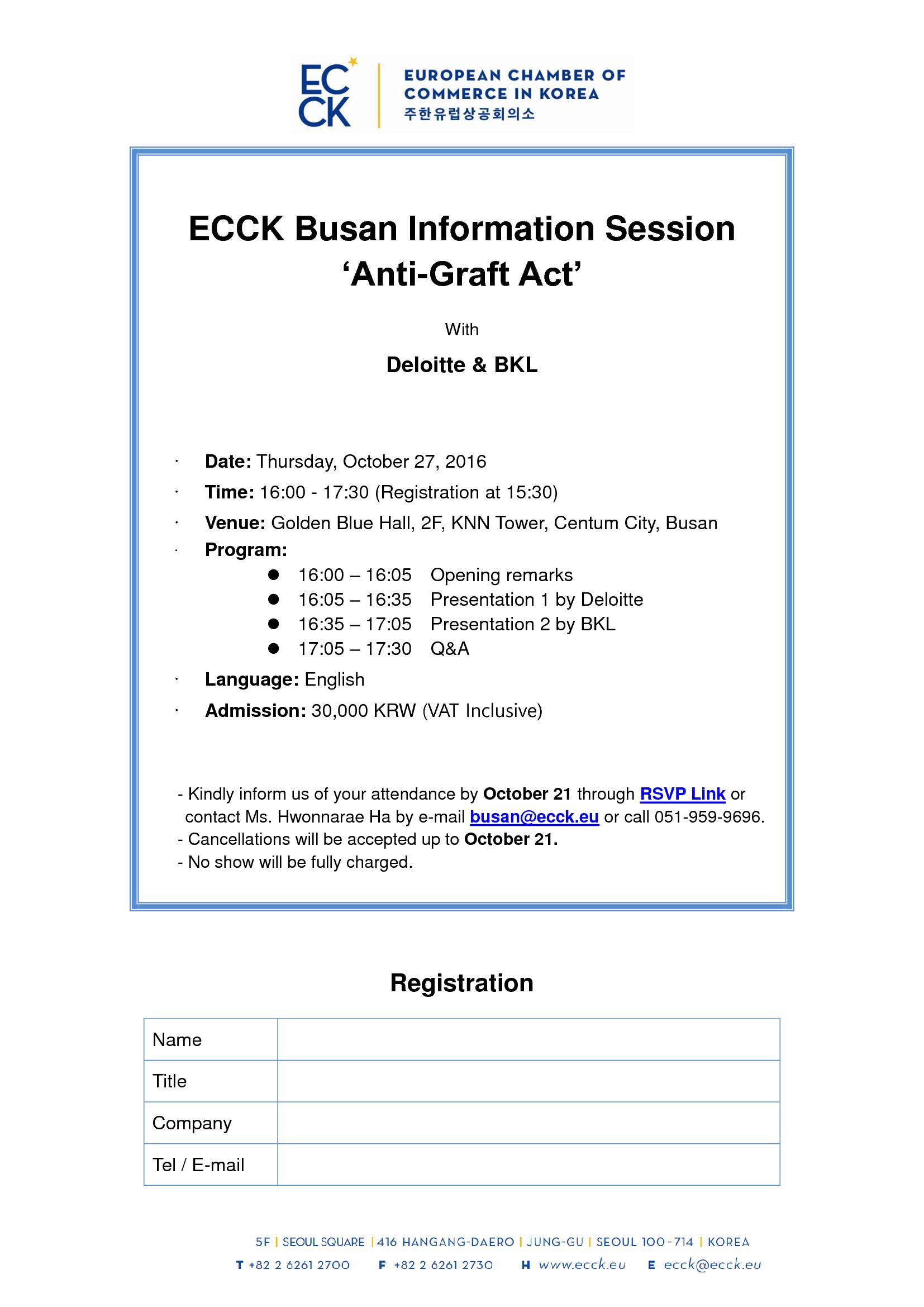 october 2016 27oct4:00 PM5:30 PMEvent OverECCK Busan Information Session ‘Anti-Graft Act’ECCK Events:ECCK Busan RSVP NowRSVPing is closed at this time. Can not make it to this event?Change my RSVP Event Details Click here to see the invitation Event Details Click here to see the invitation Time (Thursday) 4:00 PM - 5:30 PM LocationGolden Blue Hall, 2F, KNN Tower, Centum City, Busan CalendarGoogleCal