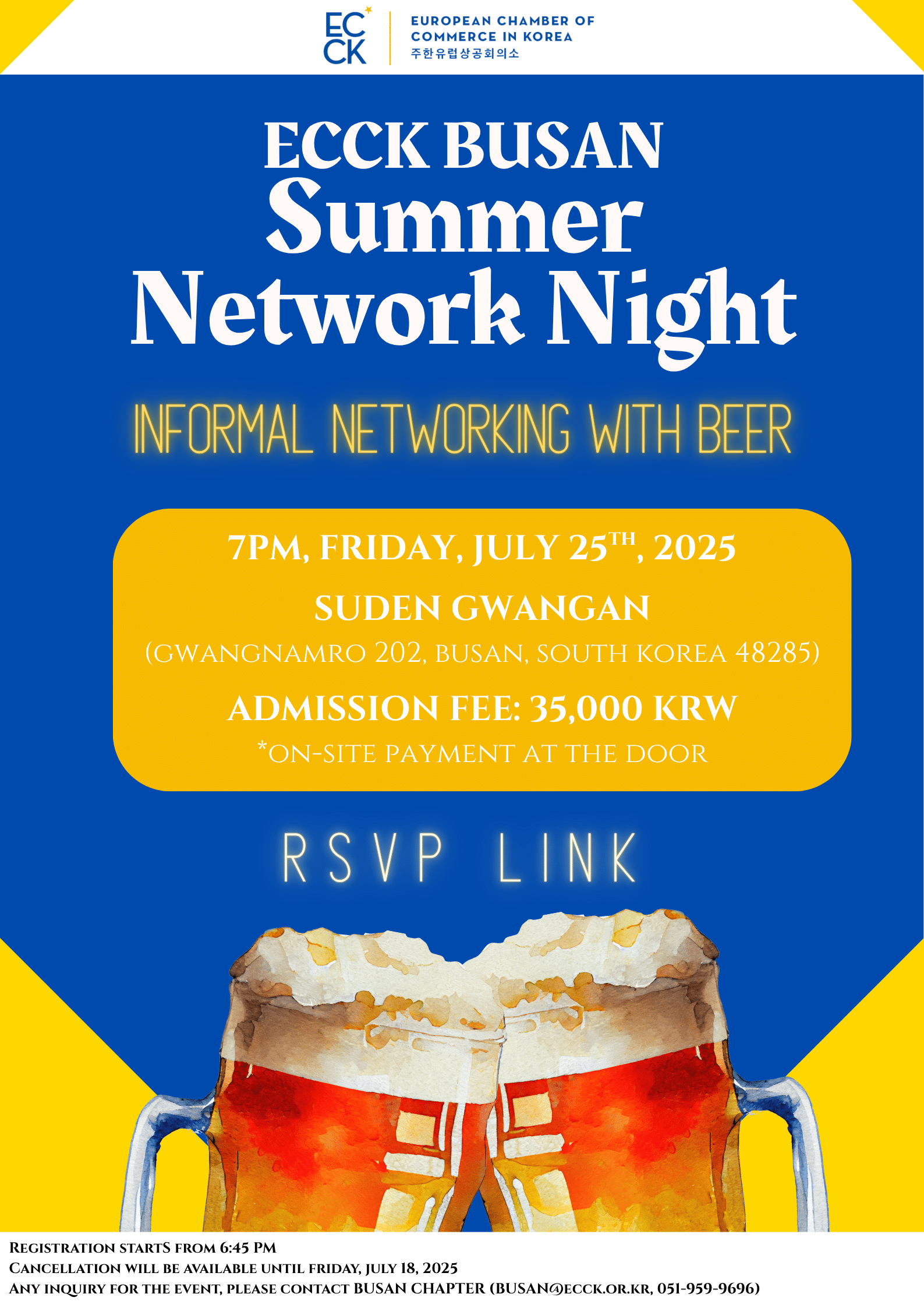 july 2025 25jul7:00 PM9:00 PMECCK Busan Summer Network NightECCK Events:ECCK Busan Event DetailsPlease click this link for register and more details Event Details Please click this link for register and more details Time (Friday) 7:00 PM - 9:00 PM LocationSuden GwanganGwangnamro 202, Busan, South Korea 48285 CalendarGoogleCal