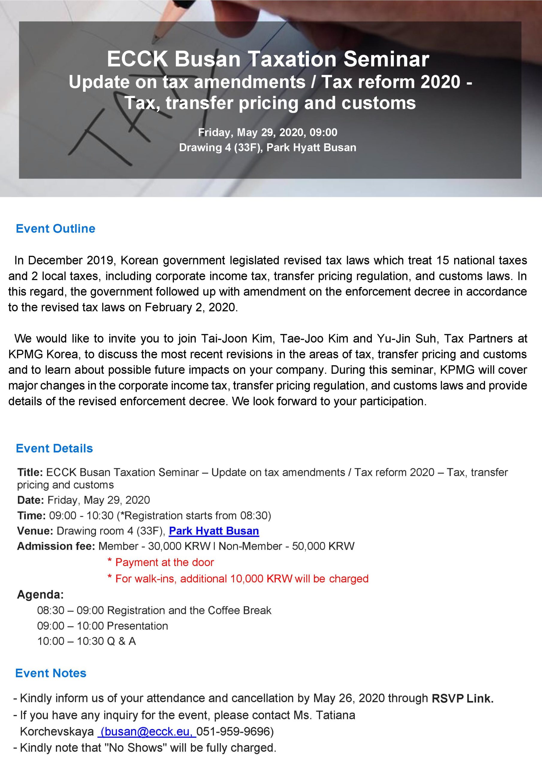 may 2020 29may9:30 AM11:00 AMEvent OverECCK Busan Taxation SeminarECCK Events:ECCK RSVP NowRSVPing is closed at this time. Can not make it to this event?Change my RSVP Event DetailsECCK Busan Taxation Seminar_Invitation_May 29 Event Details ECCK Busan Taxation Seminar_Invitation_May 29 Time (Friday) 9:30 AM - 11:00 AM LocationDrawing Room 4 (33F), Park Hyatt Busan51, Marine City 1-ro, Haeundae-gu, Busan, South Korea, 48120 CalendarGoogleCal