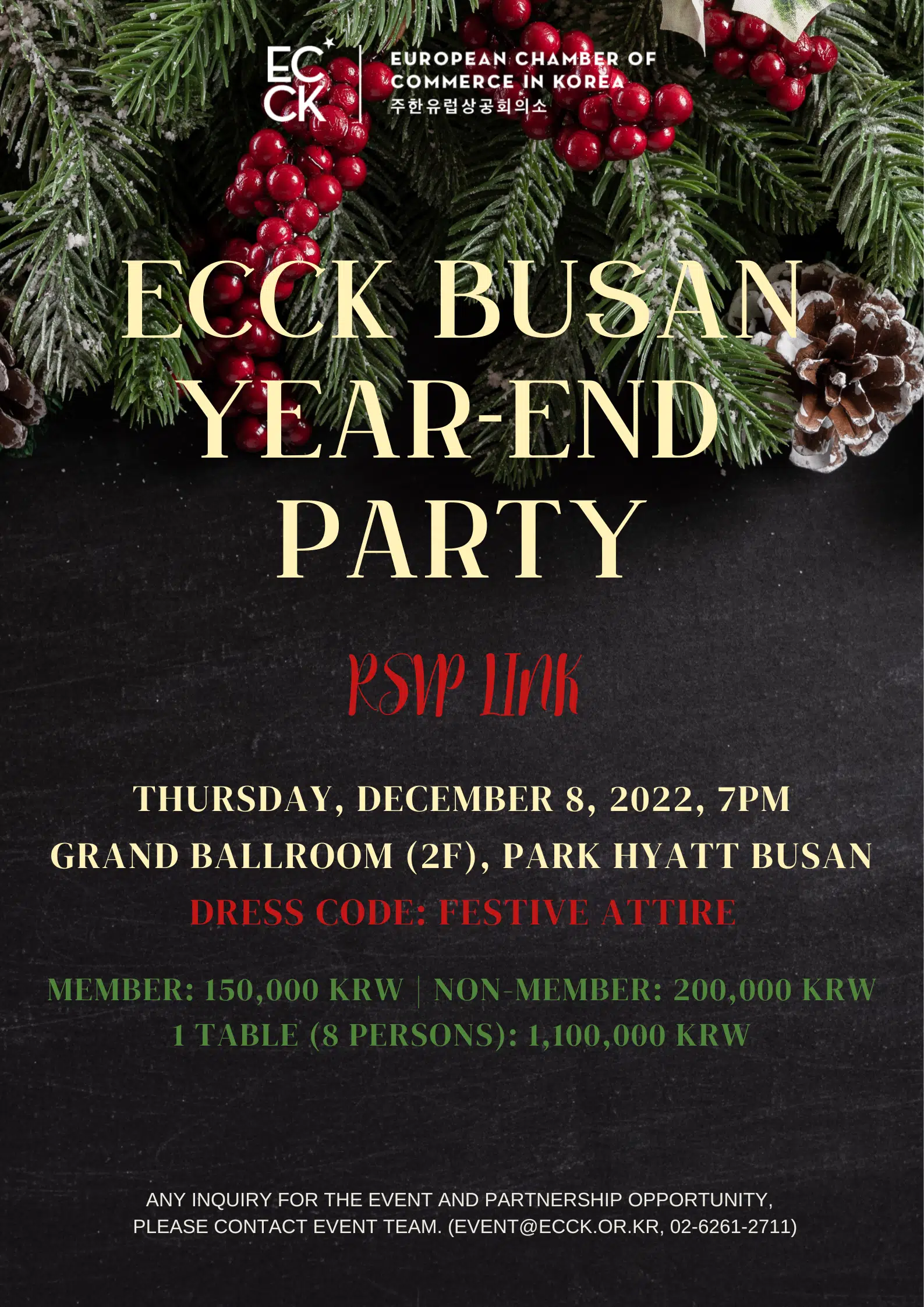 december 2022 08dec7:00 PM9:30 PMECCK Busan Year-End PartyECCK Events:ECCK Busan Event DetailsRSVP Closed ECCK Busan Year-end Party_Invitation_December 8 ECCK Busan Year-end Party_Partnership proposal_December 8 Event Details RSVP Closed ECCK Busan Year-end Party_Invitation_December 8 ECCK Busan Year-end Party_Partnership proposal_December 8 Time (Thursday) 7:00 PM - 9:30 PM LocationGrand Ballroom (2F), Park Hyatt Busan51 Marine city 1-ro, Haeundae-gu, Busan CalendarGoogleCal