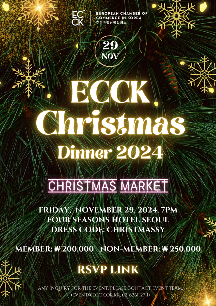 november 2024 29novAll DayECCK Christmas Dinner 2024ECCK Events:ECCK Event Details For more details and RSVP, please click this link. Partnership Proposal_ECCK Christmas Dinner 2024_Nov 29 Event Details For more details and RSVP, please click this link. Partnership Proposal_ECCK Christmas Dinner 2024_Nov 29 Time All Day (Friday) LocationFour Seasons Hotel Seoul97 Saemunan-ro, Sajik-dong, Jongno-gu, Seoul CalendarGoogleCal
