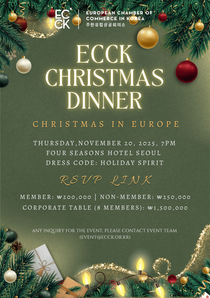 november 2025 20nov7:00 PM9:30 PMECCK Christmas Dinner 2025ECCK Events:ECCK Event Details For more details and register, please click this link. Partnership proposal_ECCK Christmas Dinner 2025_Nov.20 Event Details For more details and register, please click this link. Partnership proposal_ECCK Christmas Dinner 2025_Nov.20 Time (Thursday) 7:00 PM - 9:30 PM LocationNuri Ballroom (6F), Four Seasons Hotel Seoul97 Saemunan-ro, Jongno-gu, Seoul CalendarGoogleCal