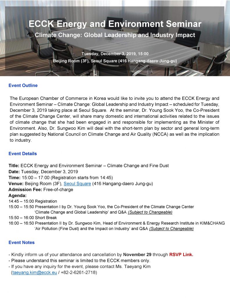 december 2019 03dec3:00 PM5:00 PMECCK Energy and Environment SeminarECCK Events:ECCK Event Details ECCK Energy and Environment Seminar_Invitation_December 3 Event Details ECCK Energy and Environment Seminar_Invitation_December 3 Time (Tuesday) 3:00 PM - 5:00 PM LocationBeijing Room (3F), Seoul Square416 Hangang-daero, Namdaemunno 5(o)-ga, Jung-gu, Seoul CalendarGoogleCal