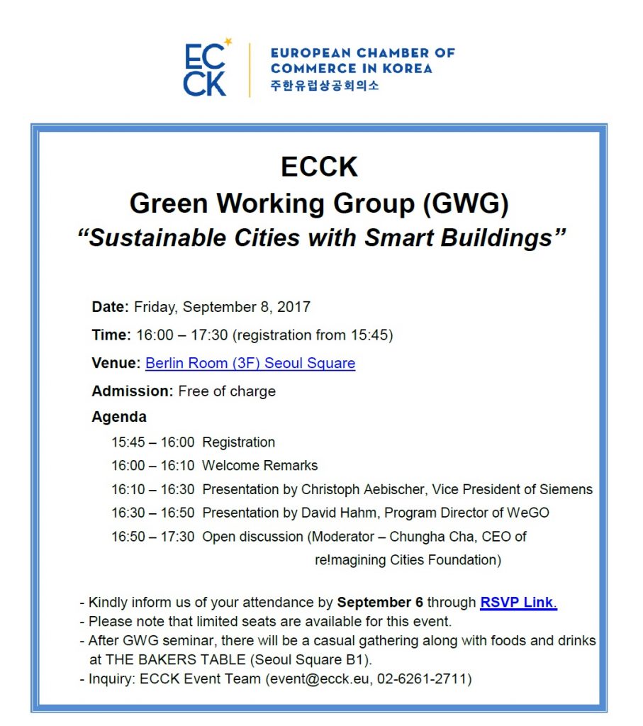 september 2017 08sep4:00 PM5:30 PMEvent OverECCK Green Working Group (GWG) Seminar“Sustainable Cities with Smart Buildings”ECCK Events:ECCK RSVP NowRSVPing is closed at this time. Can not make it to this event?Change my RSVP Event Details Click Here to find a Invitation – ECCK Green Working Group Seminar_Sep 8 Event Details Click Here to find a Invitation – ECCK Green Working Group Seminar_Sep 8 Time (Friday) 4:00 PM - 5:30 PM LocationSeoul Square CalendarGoogleCal