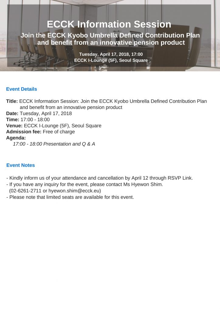april 2018 17apr5:00 PM6:00 PMEvent OverECCK Information SessionJoin the ECCK Kyobo Umbrella Defined Contribution Plan and benefit from an innovative pension RSVP NowRSVPing is closed at this time. Can not make it to this event?Change my RSVP Event DetailsECCK Information Session_April 17 Event Details ECCK Information Session_April 17 Time (Tuesday) 5:00 PM - 6:00 PM LocationSeoul Square CalendarGoogleCal