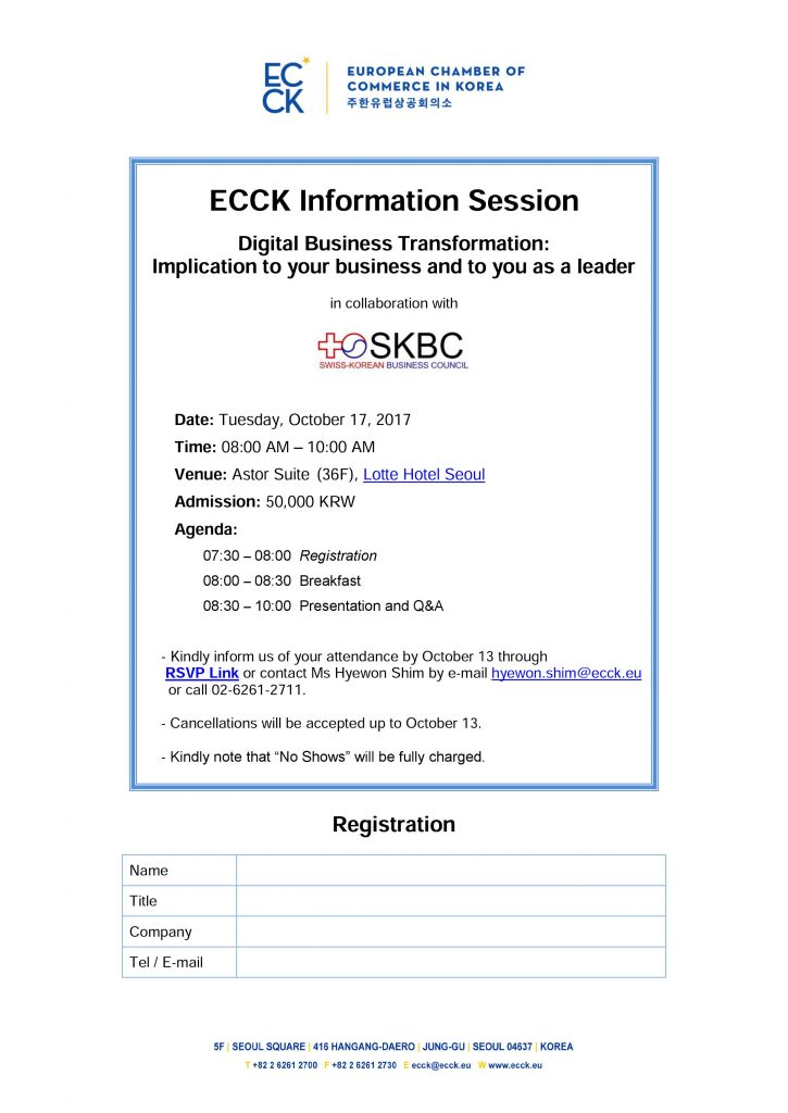 october 2017 17oct8:00 AM10:00 AMECCK Information Session: Digital Business TransformationECCK Events:ECCK Event Details171017 Information Session_Digital Business Transformation Event Details 171017 Information Session_Digital Business Transformation Time (Tuesday) 8:00 AM - 10:00 AM LocationHotel Lotte 30 Eulji-ro, Jung-gu, Seoul CalendarGoogleCal