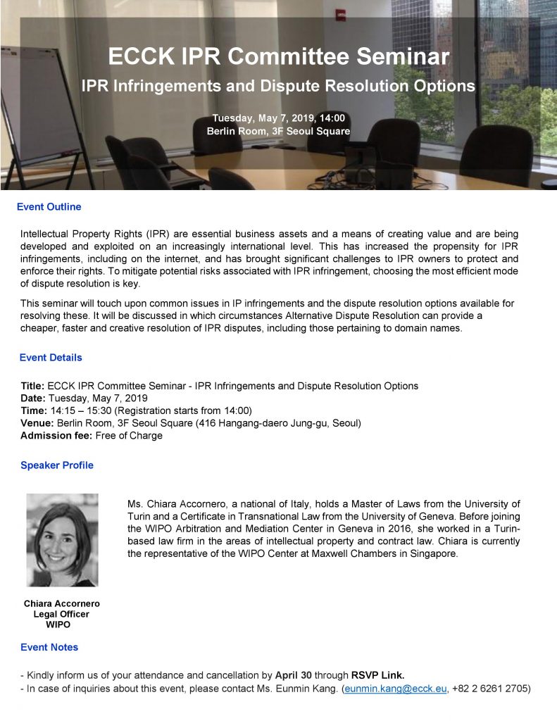 may 2019 07may2:15 PM3:30 PMECCK IPR Committee SeminarECCK Events:ECCK Committee Meeting Event Details Invitation_ECCK WIPO Seminar_May 7 Event Details Invitation_ECCK WIPO Seminar_May 7 Time (Tuesday) 2:15 PM - 3:30 PM LocationBerlin Room (3F), Seoul Square416 Hangang-daero, Namdaemunno 5(o)-ga, Jung-gu, Seoul CalendarGoogleCal