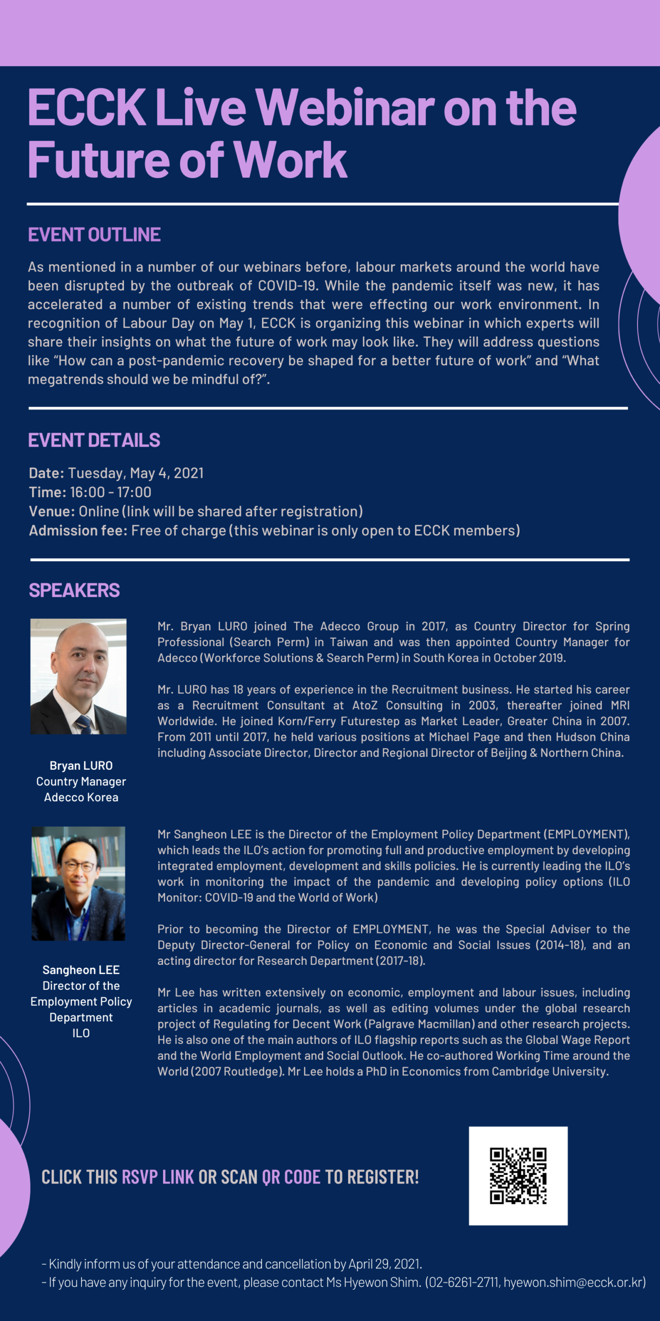 may 2021 04may4:00 PM5:00 PMECCK Live Webinar on Future of WorkECCK Events:ECCK Event DetailsRSVP Closed! ECCK Live Webinar on the Future of Work_Invitation Event Details RSVP Closed! ECCK Live Webinar on the Future of Work_Invitation Time(Tuesday) 4:00 PM - 5:00 PM CalendarGoogleCal