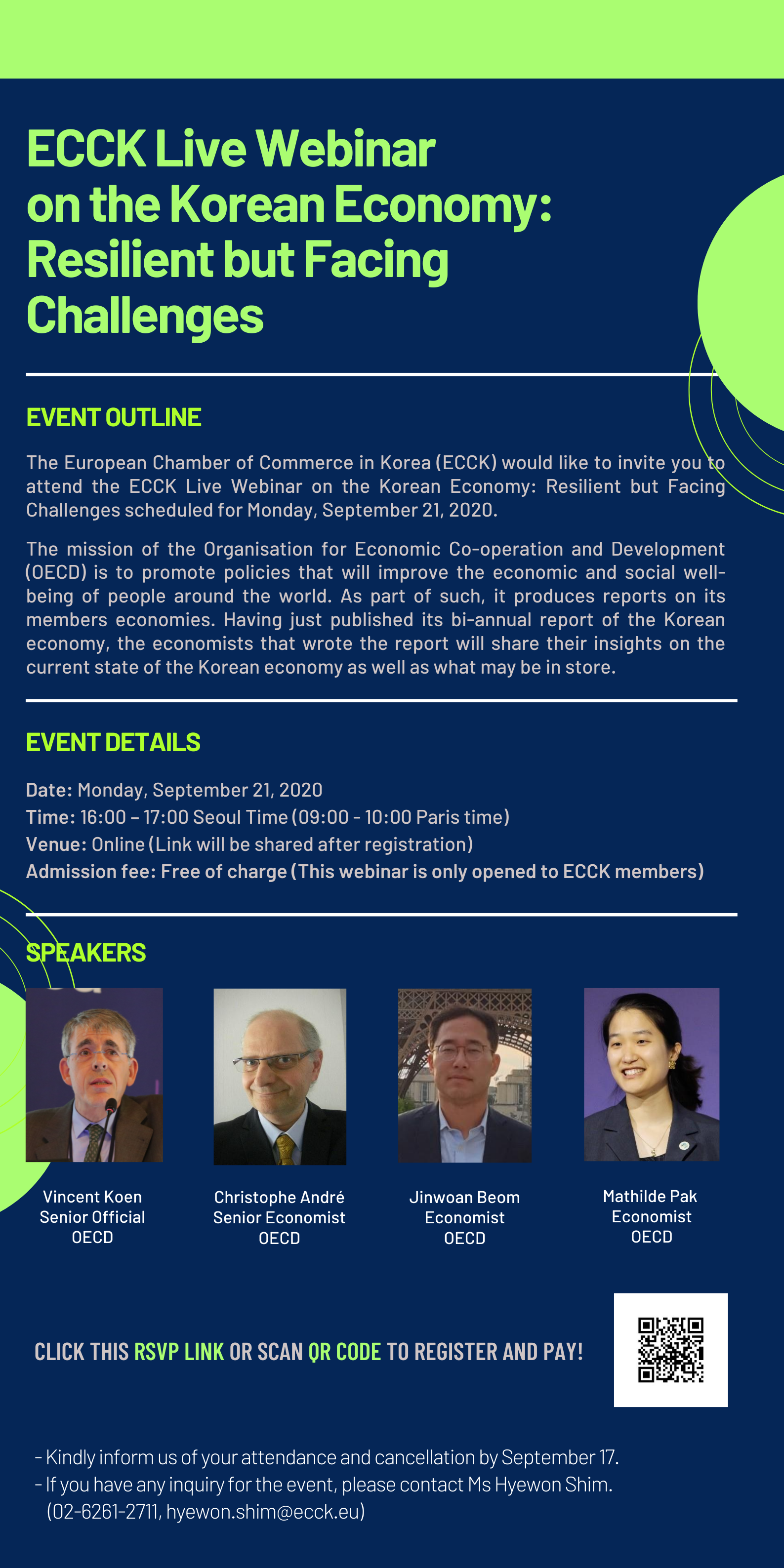 september 2020 21sep4:00 PM5:00 PMECCK Live Webinar on the Korean Economy: Resilient but Facing Challenges (OECD)ECCK Events:ECCK Event DetailsRSVP Closed! ECCK Live Webinar on the Korean Economy_Invitation Event Details RSVP Closed! ECCK Live Webinar on the Korean Economy_Invitation Time(Monday) 4:00 PM - 5:00 PM CalendarGoogleCal
