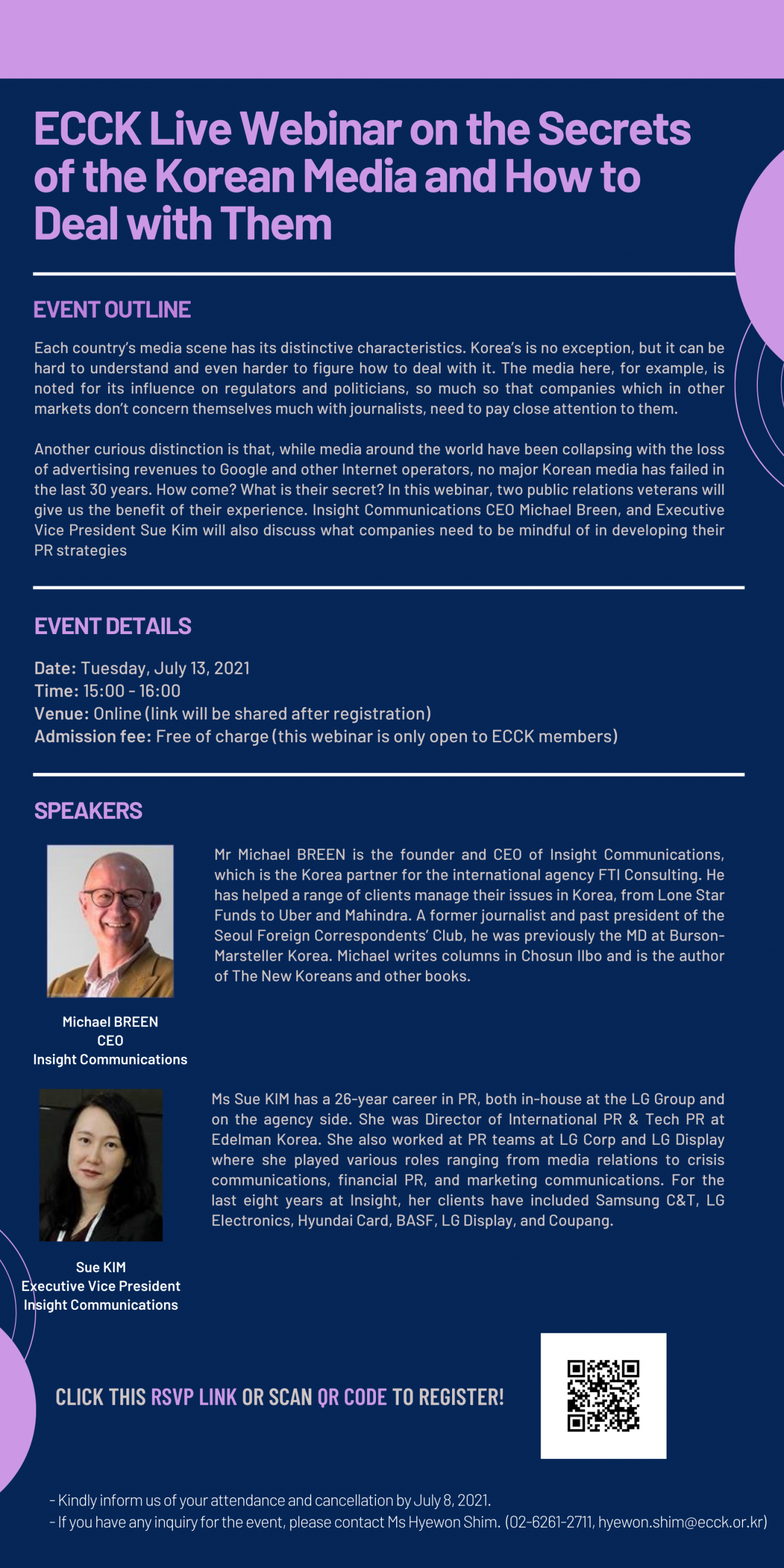 july 2021 13jul3:00 PM4:00 PMECCK Live Webinar on the Secrets of the Korean Media and How to Deal with ThemECCK Events:ECCK Event Details ECCK Live Webinar on the Secrets of the Korean Media and How to Deal with Them_Invitation Event Details ECCK Live Webinar on the Secrets of the Korean Media and How to Deal with Them_Invitation Time(Tuesday) 3:00 PM - 4:00 PM CalendarGoogleCal