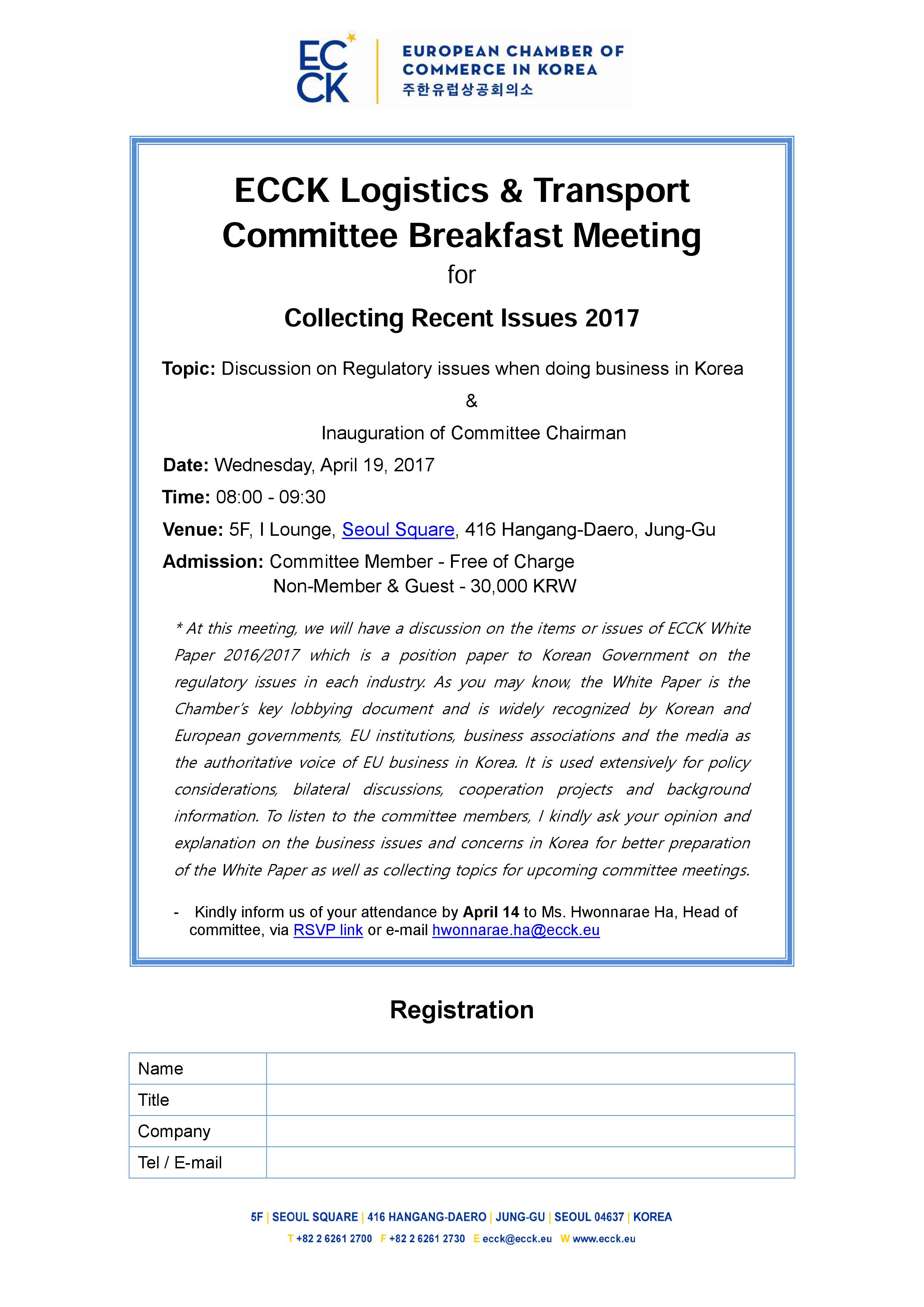 april 2017 19apr8:00 AM9:30 AMEvent OverECCK Logistics & Transport Committee Breakfast MeetingECCK Events:ECCK RSVP NowRSVPing is closed at this time. Can not make it to this event?Change my RSVP Event Details Click here to see the invitation. Event Details Click here to see the invitation. Time (Wednesday) 8:00 AM - 9:30 AM LocationSeoul Square CalendarGoogleCal