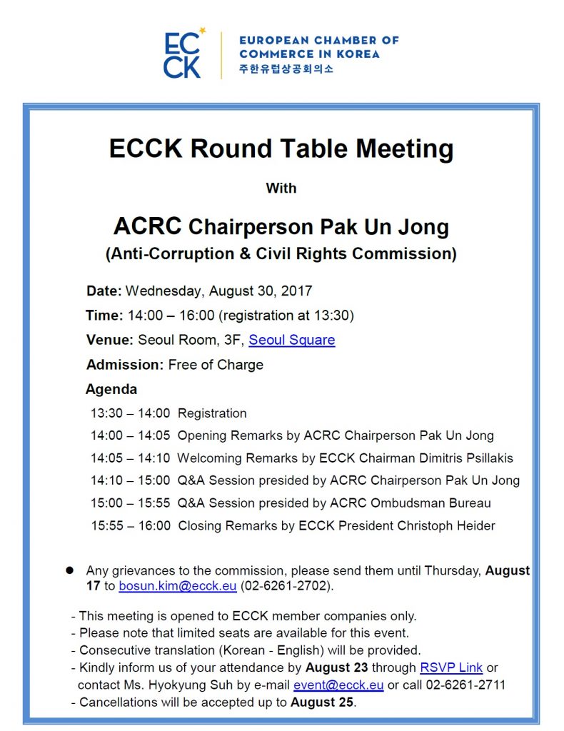 august 2017 30aug2:00 PM4:00 PMECCK Round Table Meeting with ACRC Chairperson Pak Un JongECCK Events:ECCK Event Details**RSVP for this event is closed.** Click Here to Find a Invitation – ECCK Round Table Meeting with Event Details **RSVP for this event is closed.** Click Here to Find a Invitation – ECCK Round Table Meeting with ACRC_August 30 Time (Wednesday) 2:00 PM - 4:00 PM LocationSeoul Square CalendarGoogleCal