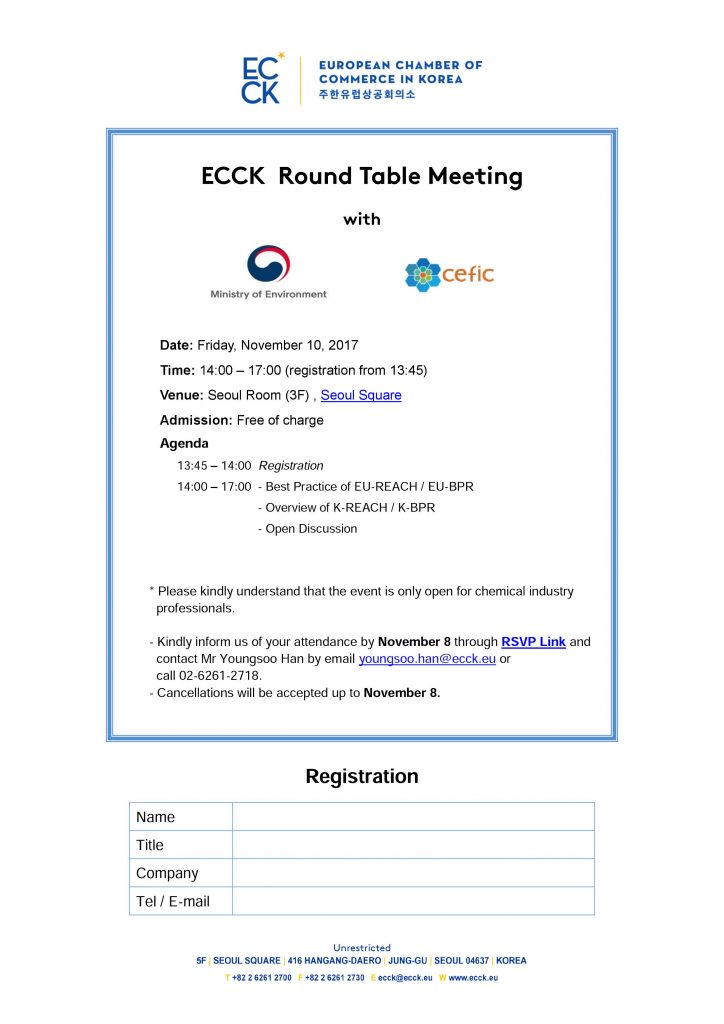 november 2017 10nov2:00 PM5:00 PMECCK Round Table Meeting with Ministry of Environment & ceficECCK Events:ECCK Event DetailsECCK Round Table Meeting with Ministry of Environment and Cefic_November 10 Event Details ECCK Round Table Meeting with Ministry of Environment and Cefic_November 10 Time (Friday) 2:00 PM - 5:00 PM LocationSeoul Square CalendarGoogleCal