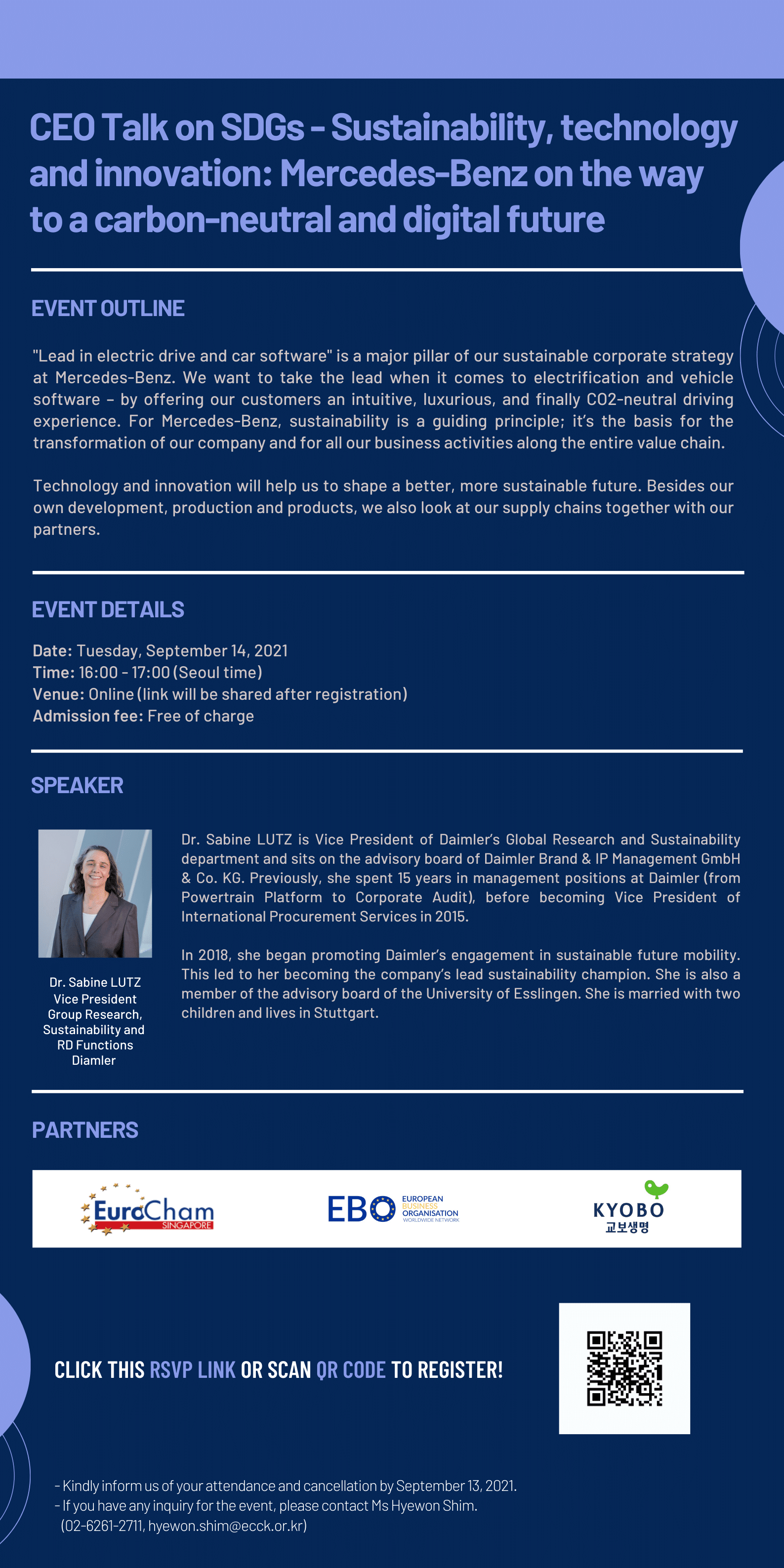 september 2021 14sep4:00 PM5:00 PMECCK SDGs Webinar Series 2021ECCK Events:ECCK Event DetailsRSVP Closed! CEO Talk on SDGs – Sustainability, technology and innovation_Invitation Event Details RSVP Closed! CEO Talk on SDGs – Sustainability, technology and innovation_Invitation Time(Tuesday) 4:00 PM - 5:00 PM CalendarGoogleCal
