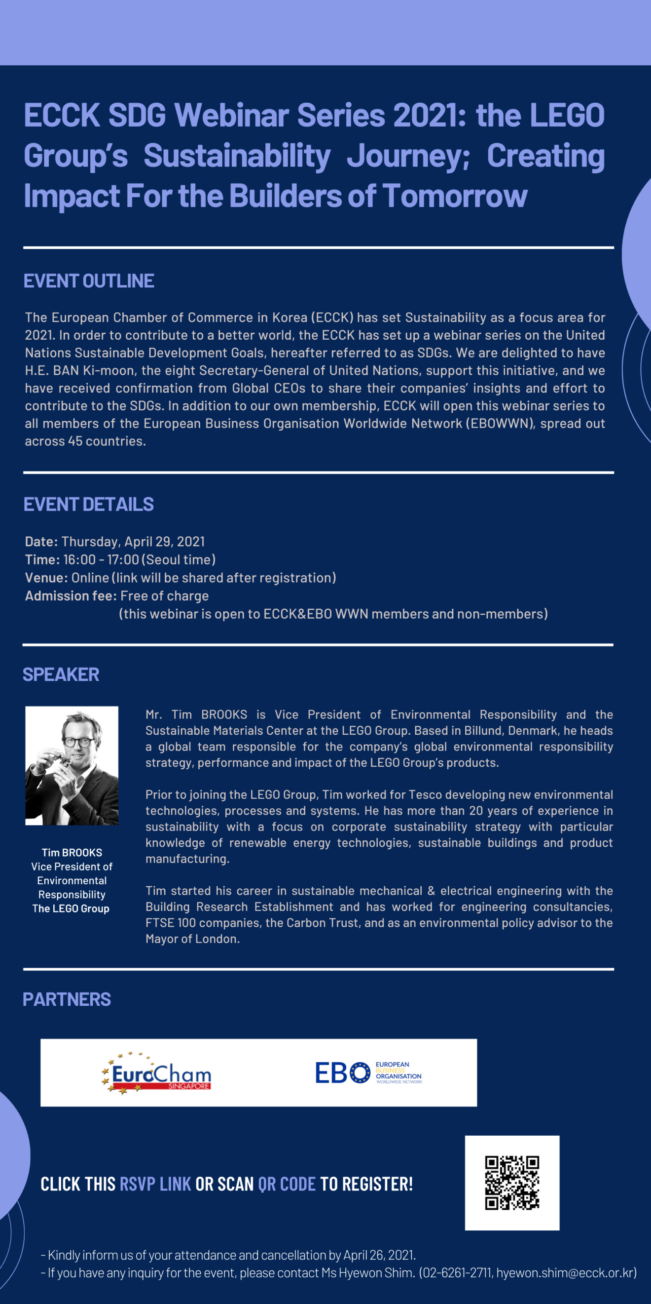 april 2021 29apr4:00 PM5:00 PMECCK SDGs Webinar Series 2021 on the LEGO group’s sustainability journeyECCK Events:ECCK Event DetailsRSVP Closed! ECCK SDGs Webinar Series 2021 on the LEGO group’s sustainability journey_Invitation Event Details RSVP Closed! ECCK SDGs Webinar Series 2021 on the LEGO group’s sustainability journey_Invitation Time(Thursday) 4:00 PM - 5:00 PM CalendarGoogleCal