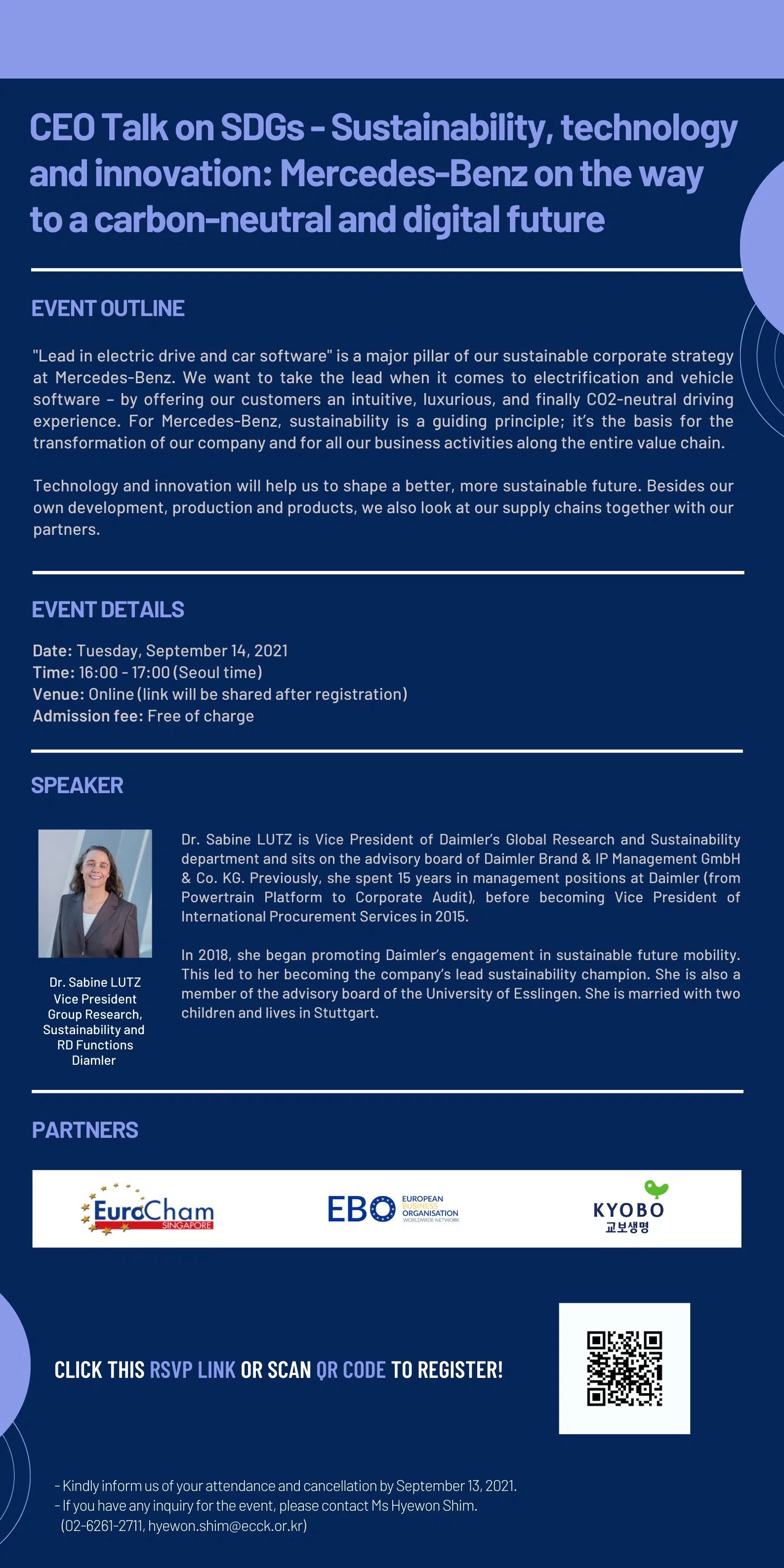 september 2021 14sep4:00 PM5:00 PMECCK SDGs Webinar Series 2021ECCK Events:ECCK Event DetailsRSVP Closed! CEO Talk on SDGs – Sustainability, technology and innovation_Invitation Event Details RSVP Closed! CEO Talk on SDGs – Sustainability, technology and innovation_Invitation Time(Tuesday) 4:00 PM - 5:00 PM CalendarGoogleCal