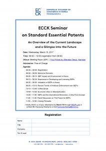 march 2017 15mar9:00 AM12:00 PMECCK Seminar on Standard Essential PatentsECCK Events:ECCK Event DetailsECCK Seminar on Standard Essential Patents – An Overview of the Current Landscape and a Glimpse Into the Future Click here Event Details ECCK Seminar on Standard Essential Patents – An Overview of the Current Landscape and a Glimpse Into the Future Click here to see the invitation. Time(Wednesday) 9:00 AM - 12:00 PM CalendarGoogleCal