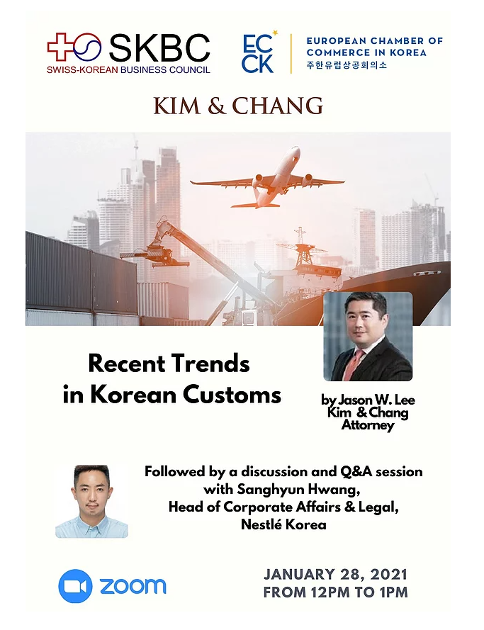 january 2021 28jan12:00 PM1:00 PMECCK-SKBC Live Webinar on Recent Trends in Korean CustomsECCK Events:ECCK Event Details RSVP Link Event Details RSVP Link Time(Thursday) 12:00 PM - 1:00 PM CalendarGoogleCal