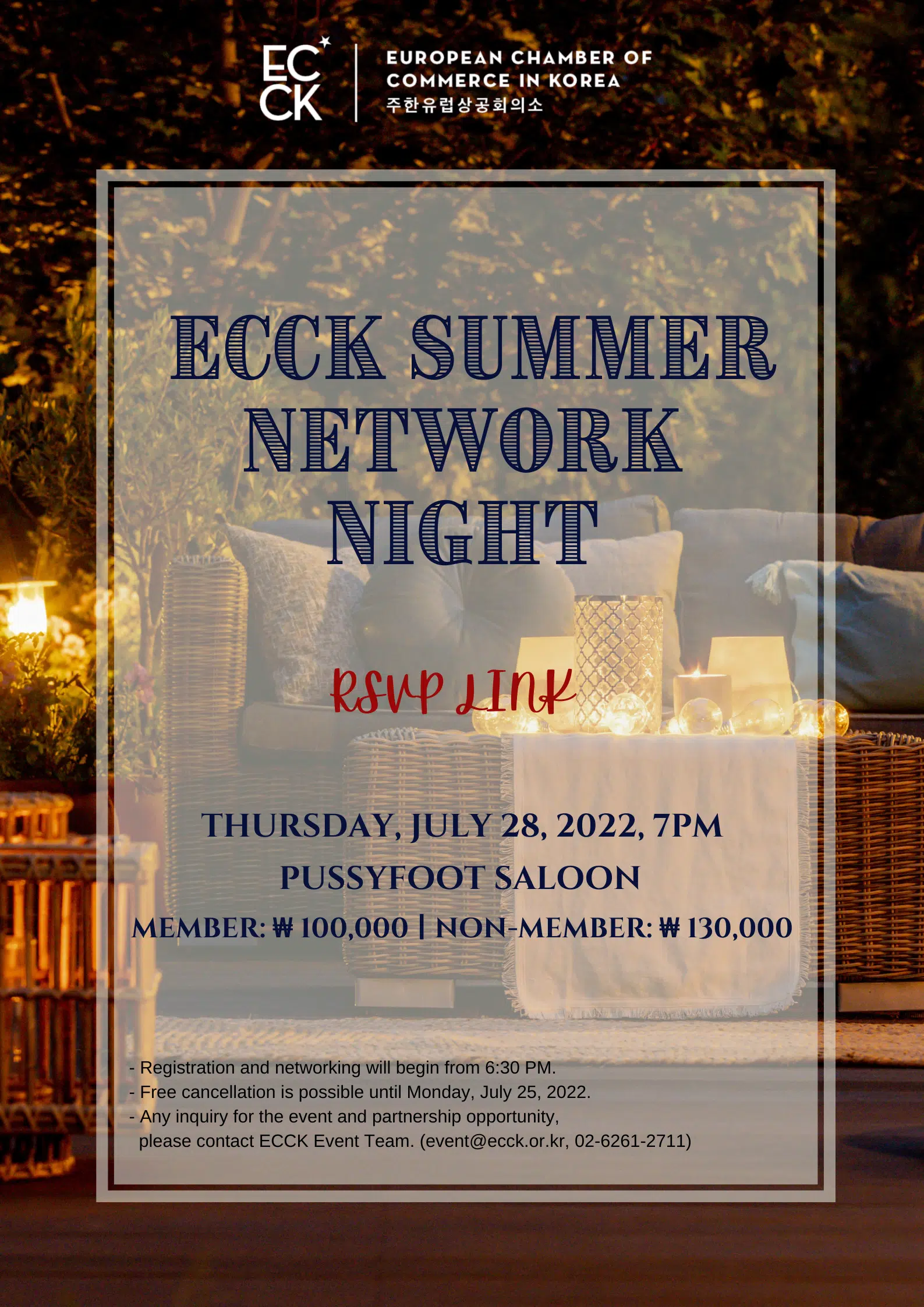 july 2022 28jul7:00 PM9:30 PMECCK Summer Network NightECCK Events:ECCK Event Details* Kindly be informed that the registration is now closed as we have reached our full capacity for the event. Thank you all for Event Details * Kindly be informed that the registration is now closed as we have reached our full capacity for the event. Thank you all for your interest. ECCK Summer Network Night 2022_Partnership Proposal_July 28 Time(Thursday) 7:00 PM - 9:30 PM CalendarGoogleCal