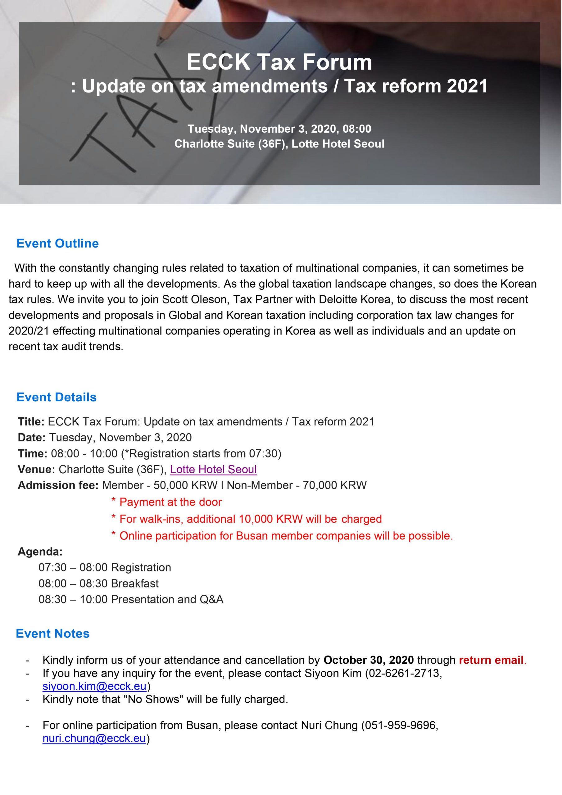 november 2020 03nov8:00 AM10:00 AMECCK Tax ForumECCK Events:ECCK Event DetailsECCK Tax Forum_Invitation Event Details ECCK Tax Forum_Invitation Time(Tuesday) 8:00 AM - 10:00 AM CalendarGoogleCal
