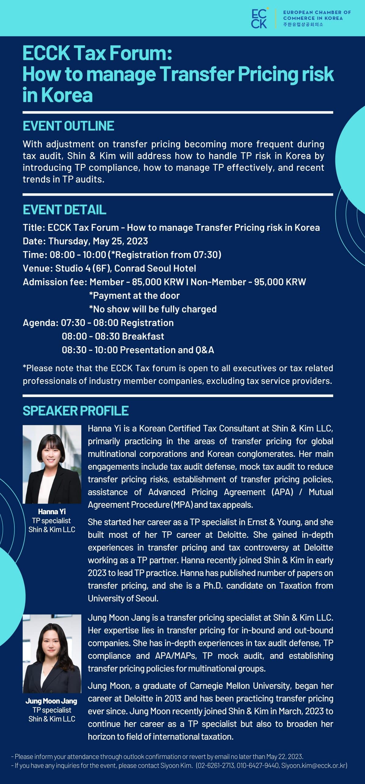 may 2023 25may8:00 AM10:00 AMECCK Tax ForumECCK Events:ECCK Event DetailsECCK Tax Forum *If you wish to participate, please contact Siyoon Kim (02-6261-2713 / siyoon.kim@ecck.or.kr) Event Details ECCK Tax Forum *If you wish to participate, please contact Siyoon Kim (02-6261-2713 / rk.ro.kcce@mik.nooyis) Time(Thursday) 8:00 AM - 10:00 AM CalendarGoogleCal