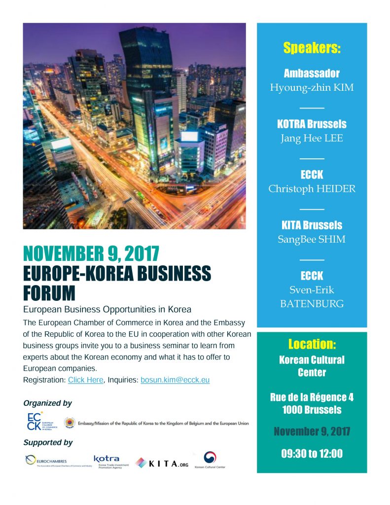 november 2017 09nov9:30 AM12:00 AMEvent OverEUROPE-KOREA BUSINESS FORUM AT BRUSSELSECCK Events:ECCK RSVP NowRSVPing is closed at this time. Can not make it to this event?Change my RSVP Event Details20171109 Europe Korea Business Forum at Brussels Event Details 20171109 Europe Korea Business Forum at Brussels Time(Thursday) 9:30 AM - 12:00 AM CalendarGoogleCal