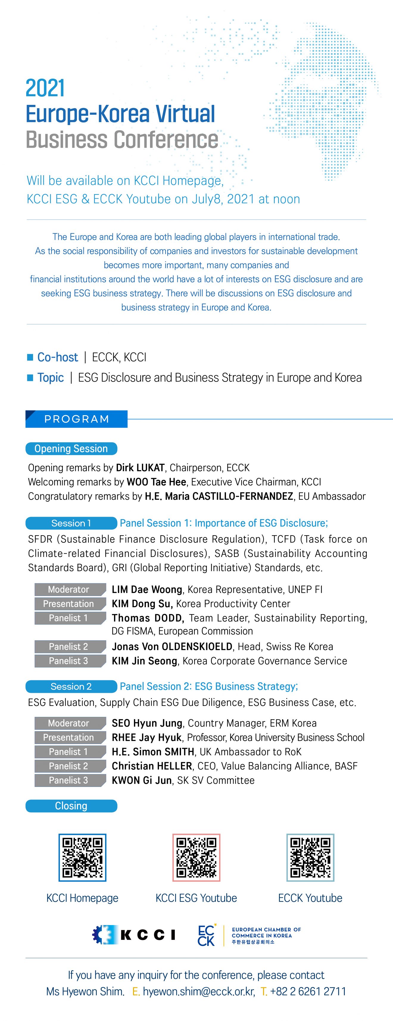 july 2021 08jul12:00 PM2:00 PM2021 Europe-Korea Virtual Business ConferenceECCK Events:ECCK Event Details Will be available on ECCK Youtube on July 8, Event Details Will be available on ECCK Youtube on July 8, 2021 at noon. 2021 Europe-Korea Virtual Business Conference_Invitation Time(Thursday) 12:00 PM - 2:00 PM CalendarGoogleCal