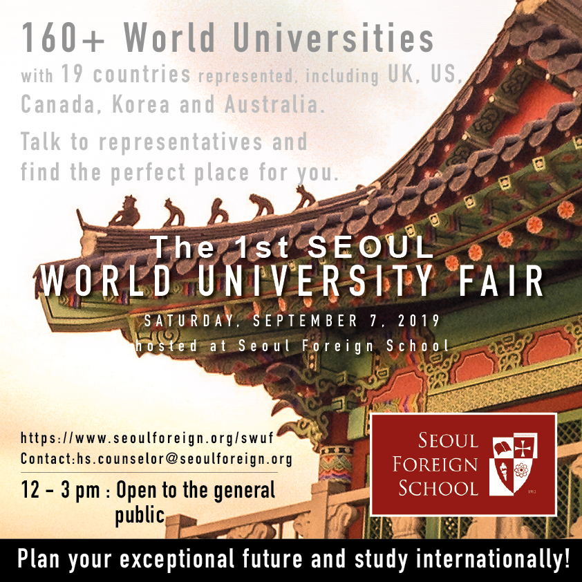september 2019 07sep12:00 PM3:00 PM[EXTERNAL] 1st Seoul World University FairExternal Events:External Events Event Details VISIT OFFICIAL WEBSITE TO FIND MORE INFORMATION! Event Details VISIT OFFICIAL WEBSITE TO FIND MORE INFORMATION! Time (Saturday) 12:00 PM - 3:00 PM LocationSeoul Foreign School39 Yeonhui-ro 22-gil, Yeonhui-dong, Seodaemun-gu, Seoul CalendarGoogleCal