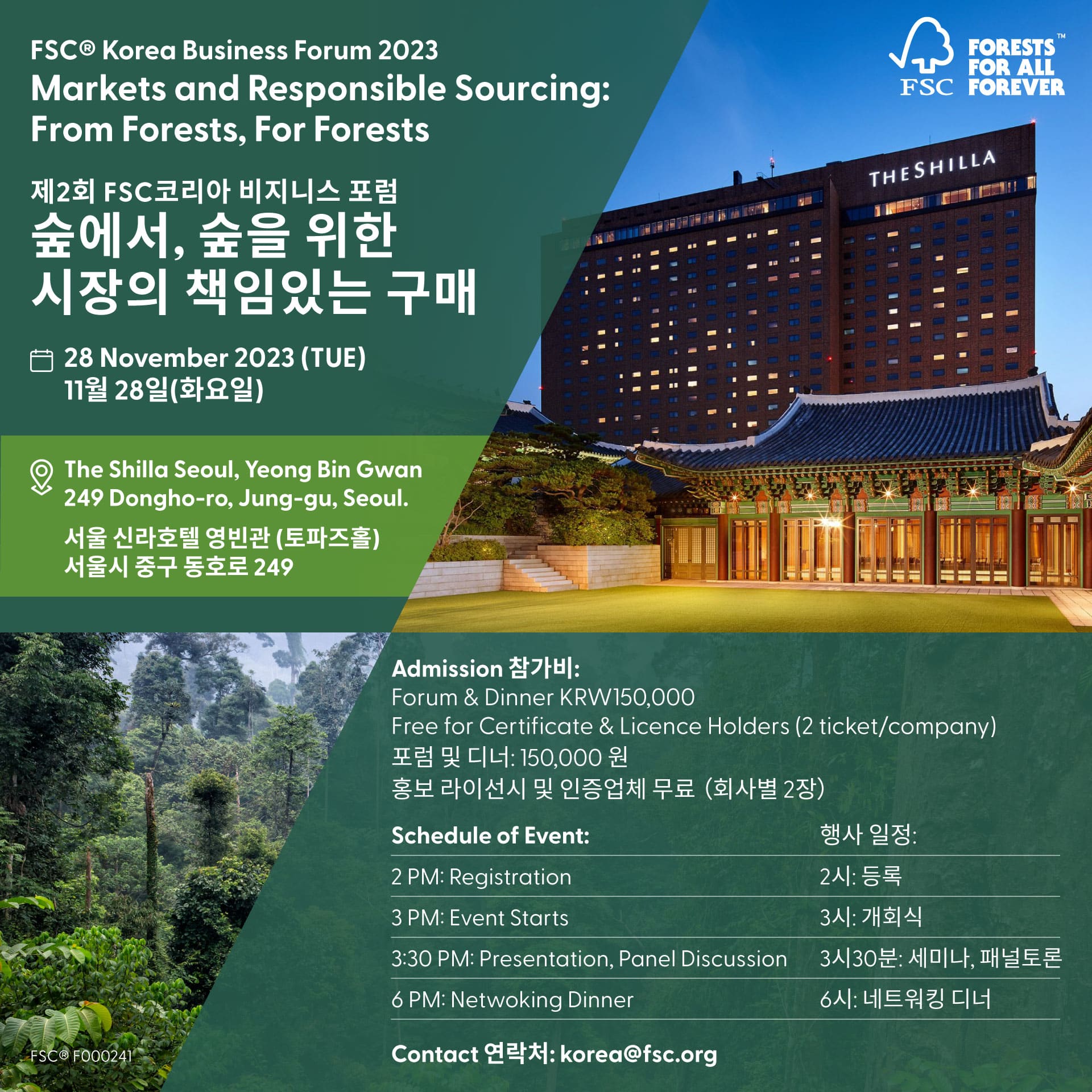 november 2023 28nov2:00 PM6:00 PM[EXTERNAL] FSC Korea Business Forum 2023ECCK Events:ECCK Event Details Event Details Time (Tuesday) 2:00 PM - 6:00 PM LocationYeong Bin Gwan, The Shilla Seoul249 Dongho-ro, Jung-gu, Seoul CalendarGoogleCal
