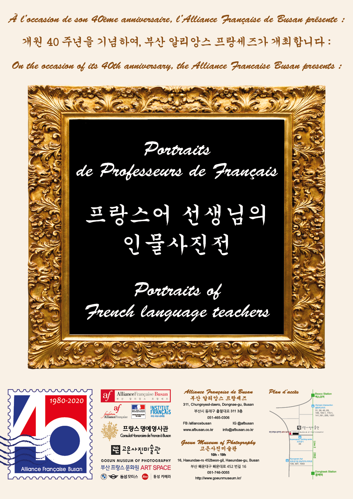 october 2020 08oct5:30 PM6:30 PM[External] Portraits of French language TeachersExternal Events:External Events Event Details Portraits of (Korean) French Teachers_INVITATION On the occasion of his 40th birthday the Alliance Française de Busan is Event Details Portraits of (Korean) French Teachers_INVITATION On the occasion of his 40th birthday the Alliance Française de Busan is pleased to invite you to visit a photo / video exhibition concerning the profession of French teacher “Portraits of (Korean) French Teachers” Time(Thursday) 5:30 PM - 6:30 PM CalendarGoogleCal