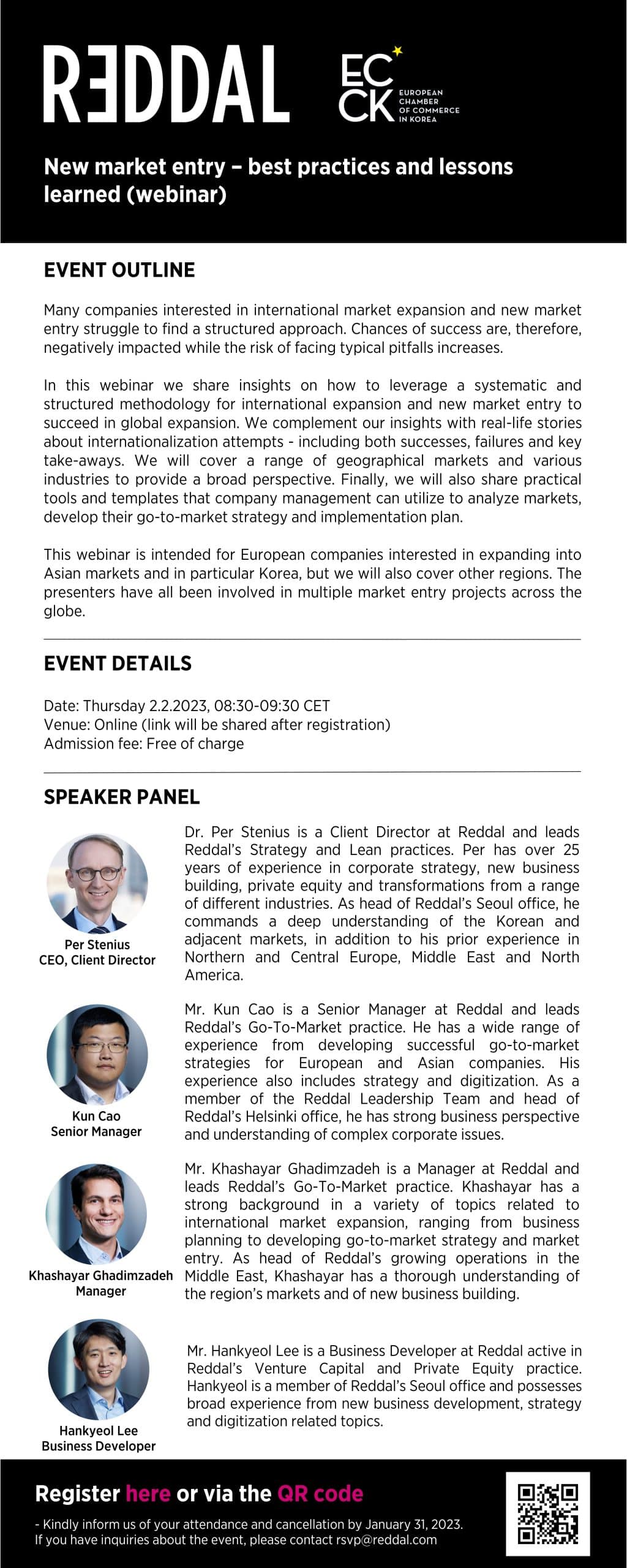 february 2023 02feb4:30 PM5:30 PMECCK & REDDAL Webinar on New market entryECCK Events:ECCK Event DetailsRSVP Link ECCK & REDDAL Webinar on New market entry – best practices and lessons learned from new market Event Details RSVP Link ECCK & REDDAL Webinar on New market entry – best practices and lessons learned from new market entry Time(Thursday) 4:30 PM - 5:30 PM CalendarGoogleCal