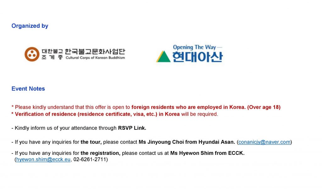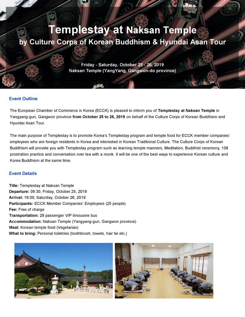 october 2019 25oct(oct 25)9:30 AM26(oct 26)4:00 PM[EXTERNAL] Templestay at Naksan TempleExternal Events:External Events Event Details Templestay with Naksan Temple_Invitation_October 25-26 RSVP Link Event Details Templestay with Naksan Temple_Invitation_October 25-26 RSVP Link Time 25 (Friday) 9:30 AM - 26 (Saturday) 4:00 PM LocationNaksan Temple100 Naksansa-ro, Ganghyeon-myeon, Yangyang, Gangwon-do CalendarGoogleCal