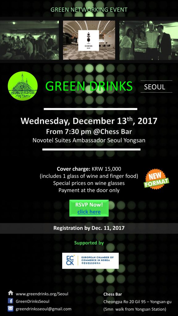 december 2017 13dec7:30 PM9:30 PMGreen Drinks Seoul Event DetailsRSVP LINK Event Details RSVP LINK Time (Wednesday) 7:30 PM - 9:30 PM LocationChess barYongsan-gu, Hangangno 3(sam)-ga, Cheongpa-ro 20-gil, 83 CalendarGoogleCal