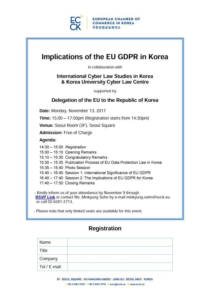 november 2017 13nov3:00 PM6:00 PMEvent OverImplications of the EU GDPR in KoreaECCK Events:ECCK RSVP NowRSVPing is closed at this time. Can not make it to this event?Change my RSVP Event Details Event Details Time (Monday) 3:00 PM - 6:00 PM LocationSeoul Square CalendarGoogleCal