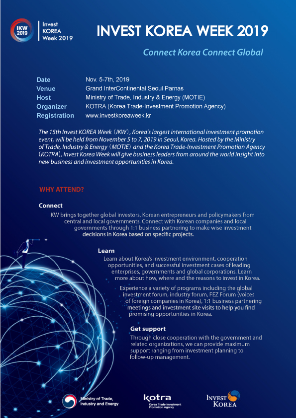 INVEST KOREA WEEK 2019 Every year, Invest KOREA holds Invest Korea Week to promote Korea’s investment environment and attract foreign direct investment. The week-long event