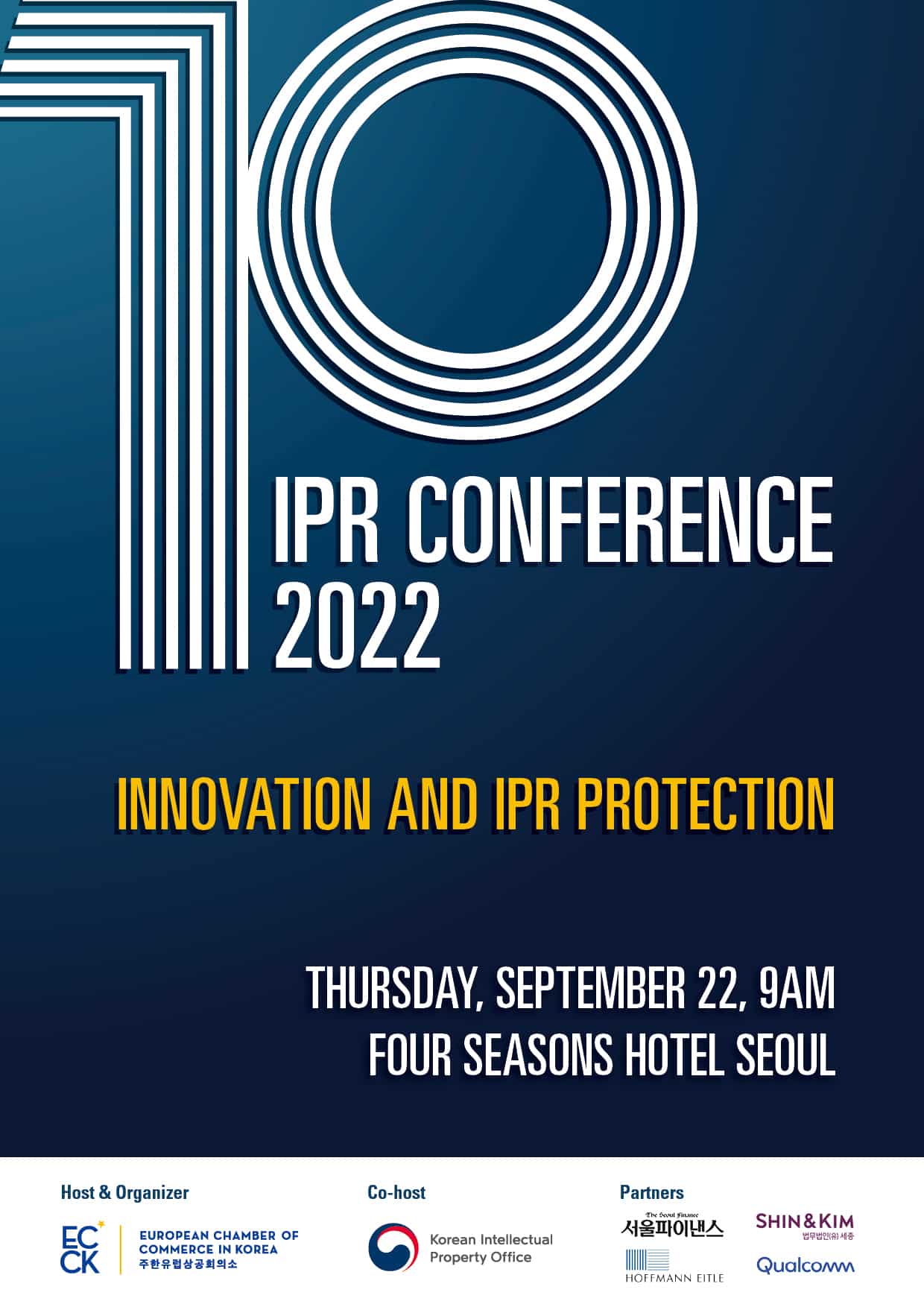 september 2022 22sep9:00 AM3:00 PMIPR Conference 2022ECCK Events:ECCK Event DetailsRSVP Closed! ECCK 2022 IPR Conference Invitation 주한유럽상공회의소 2022 지식재산권 컨퍼런스 초청장 Event Details RSVP Closed! ECCK 2022 IPR Conference Invitation 주한유럽상공회의소 2022 지식재산권 컨퍼런스 초청장 Time (Thursday) 9:00 AM - 3:00 PM LocationNuri Ballroom (6F), Four Seasons Hotel Seoul97 Saemunan-ro, Jongno-gu, Seoul CalendarGoogleCal