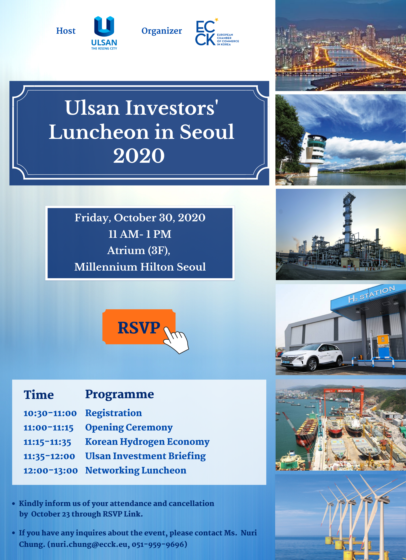 october 2020 30oct11:00 AM1:00 PMEvent OverUlsan Investors' Luncheon in Seoul 2020ECCK Events:ECCK,ECCK Busan RSVP NowRSVPing is closed at this time. Can not make it to this event?Change my RSVP Event Details Ulsan Investors’ Luncheon in Seoul Event Details Ulsan Investors’ Luncheon in Seoul Time (Friday) 11:00 AM - 1:00 PM LocationAtrium (3F), Millennium Hilton Seoul50 Sowol-ro, Namdaemunno 5(o)-ga, Jung-gu, Seoul CalendarGoogleCal